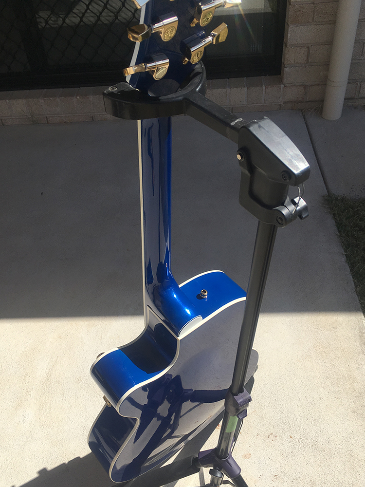 - Finished with automotive acrylic lacquer, I used clear acrylic lacquer to seal the timber. Translucent burst on the top and head stock, (60% clear,20% pearl and20% colour then 6 coats of clear), Solid colour back sides and neck (Grey primer, 80% colour, 20% pearl plus 6 coats of clear). Final sanding to 2000 grit then cut polish.