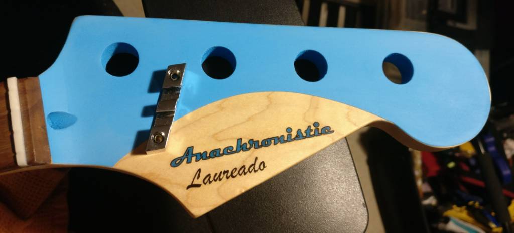 Made some progress... I think I now have the color on the headstock and it is looking reasonably good. Put on the decal as well so that it would be ready for the top coat.