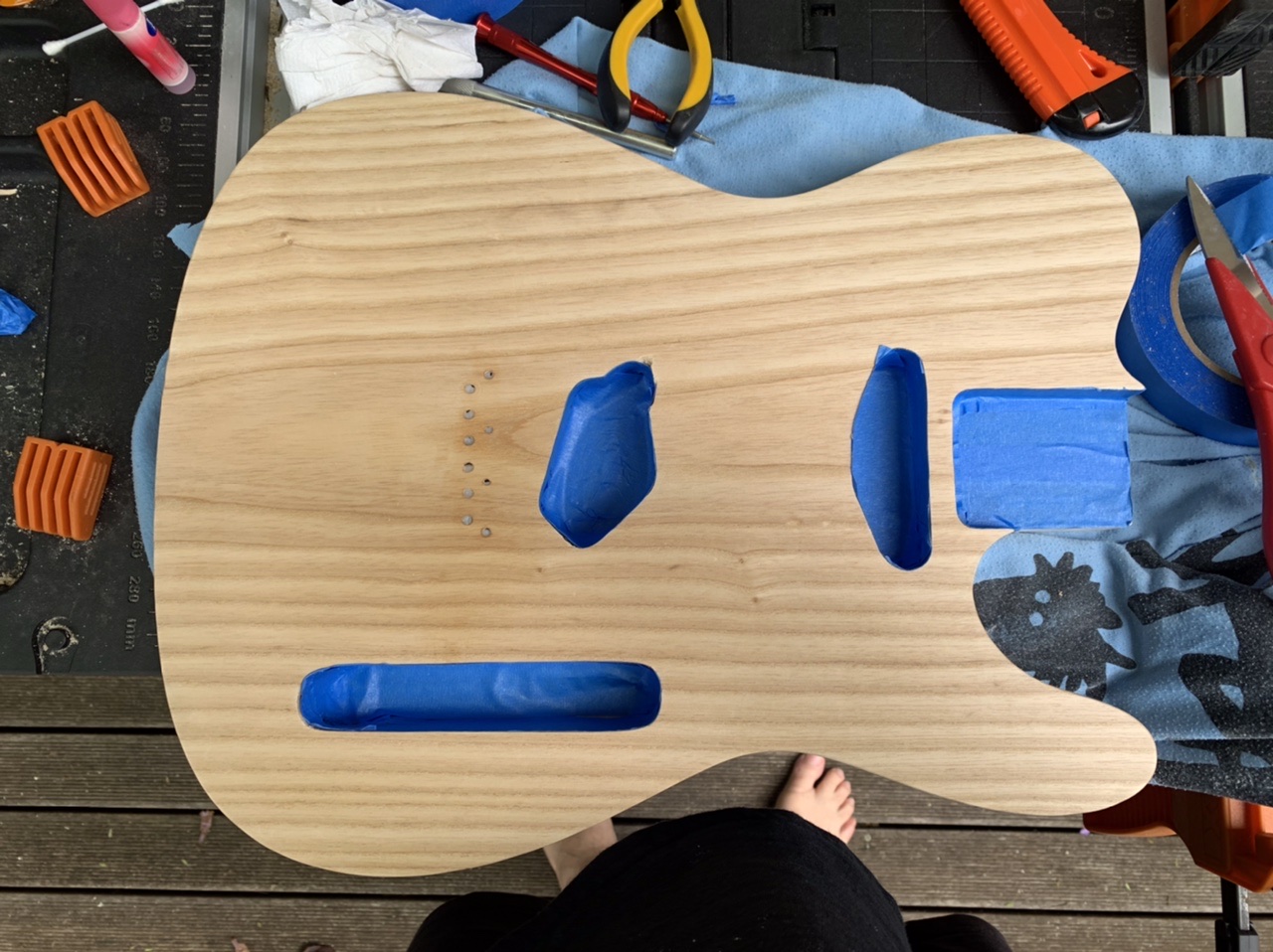 Masked off the cavities and pocket and used some old lip balm to put into string through holes and screw holes. To keep I