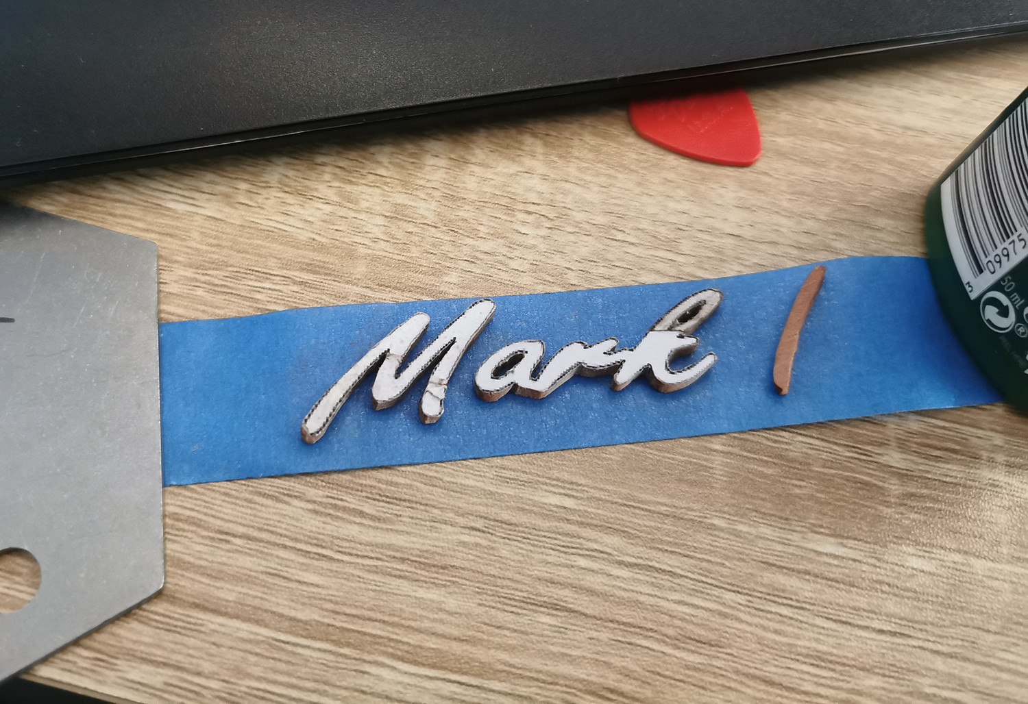 After a significant amount of time spent in the Idiot Lab™ testing a bunch of different materials and methods, I concede defeat on the wire inlay front. The gauge of wire I was looking at for the right looking thickness was around 23 to 26 gauge, around the 0.5mm mark. I tried regular round wire and had some success, but getting it to stay flat was almost impossible.. Flat wire (around 0.6 x 4mm) seemed promising, but I couldn't get anything that was malleable enough to work on the tight corners. Flat silver wire would probably work, but I didn't want to fork out for something that I might not be able to get working.