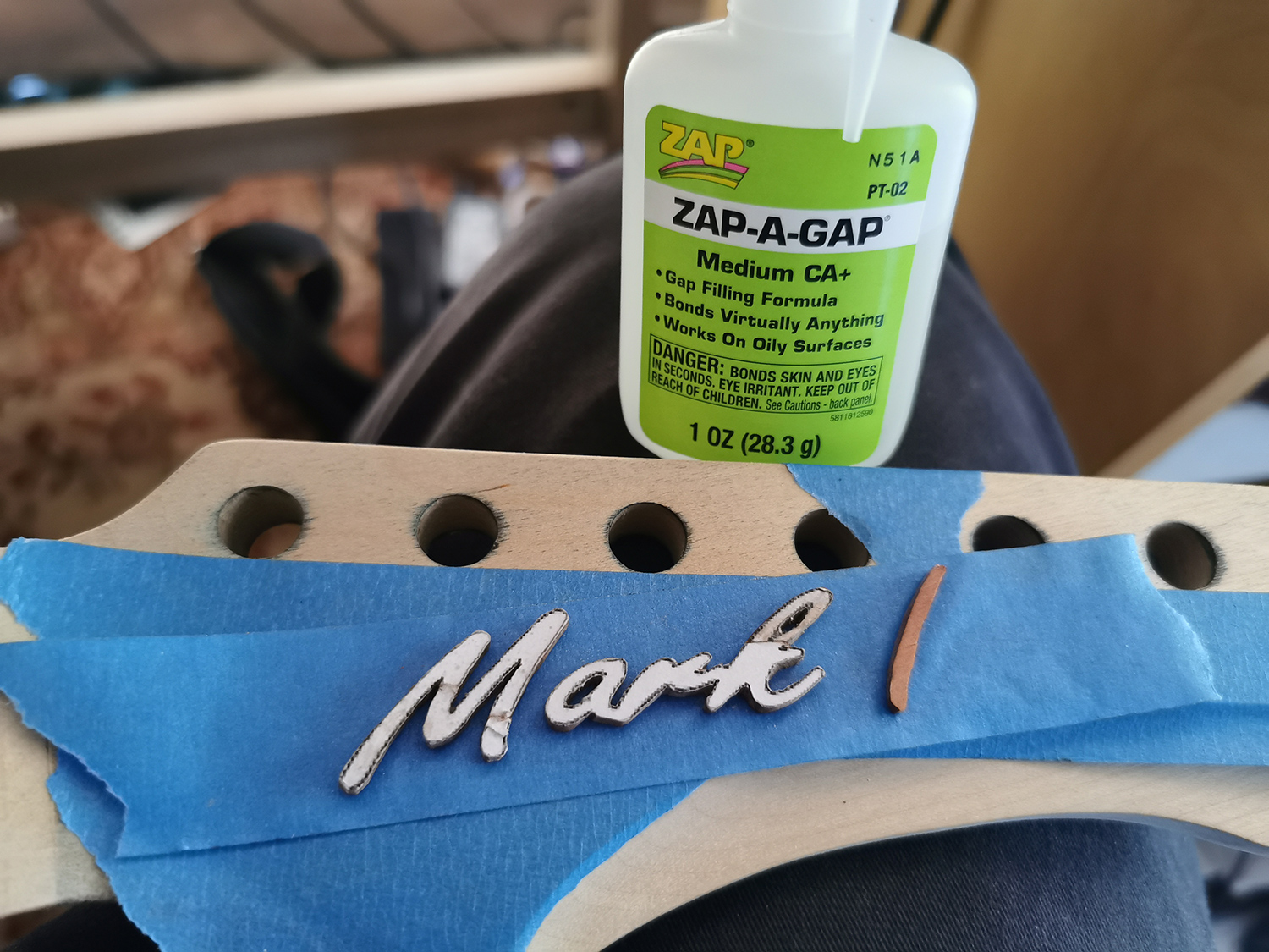 Then I covered the section of headstock I was inlaying with tape, and superglued my layout down to it.