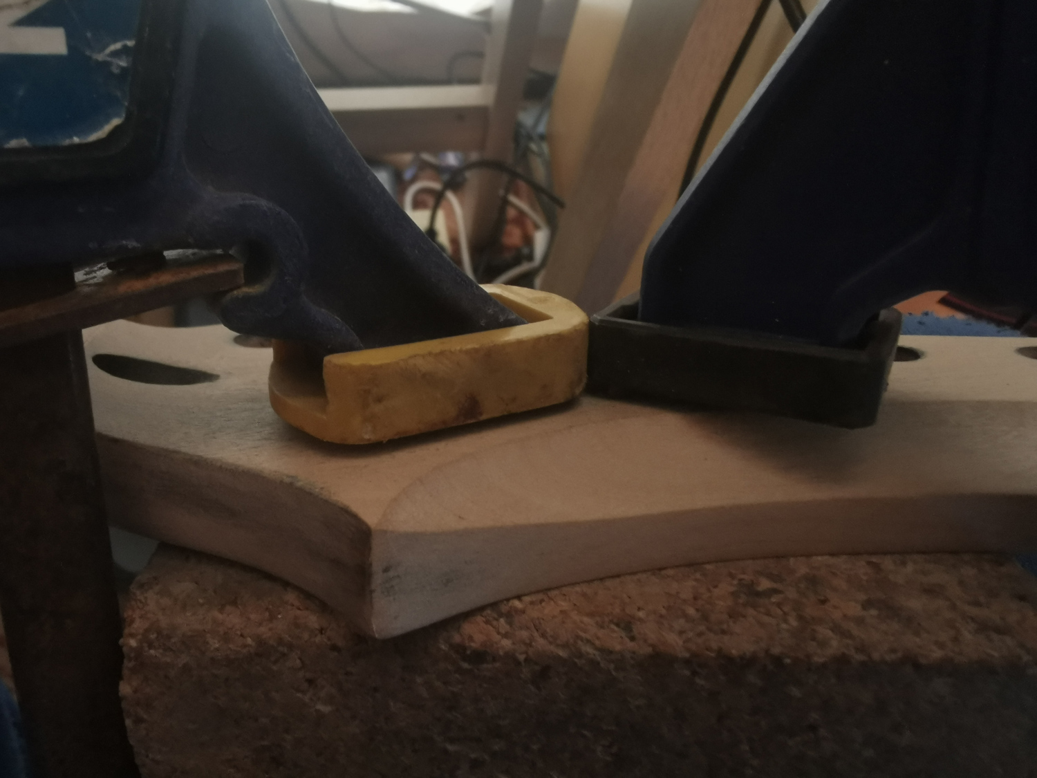 It took a while but I successfully hand routed the cavities with scalpels. Overly successful in fact as you'll see. I glued them down with CA glue and clamped with a cork sanding block under the headstock. The CA didn't take successfully in a bunch of spots, so I had to run more in. I was hoping not to get any CA along the edges so I could fill the gaps properly, so this might mean more work in the future.