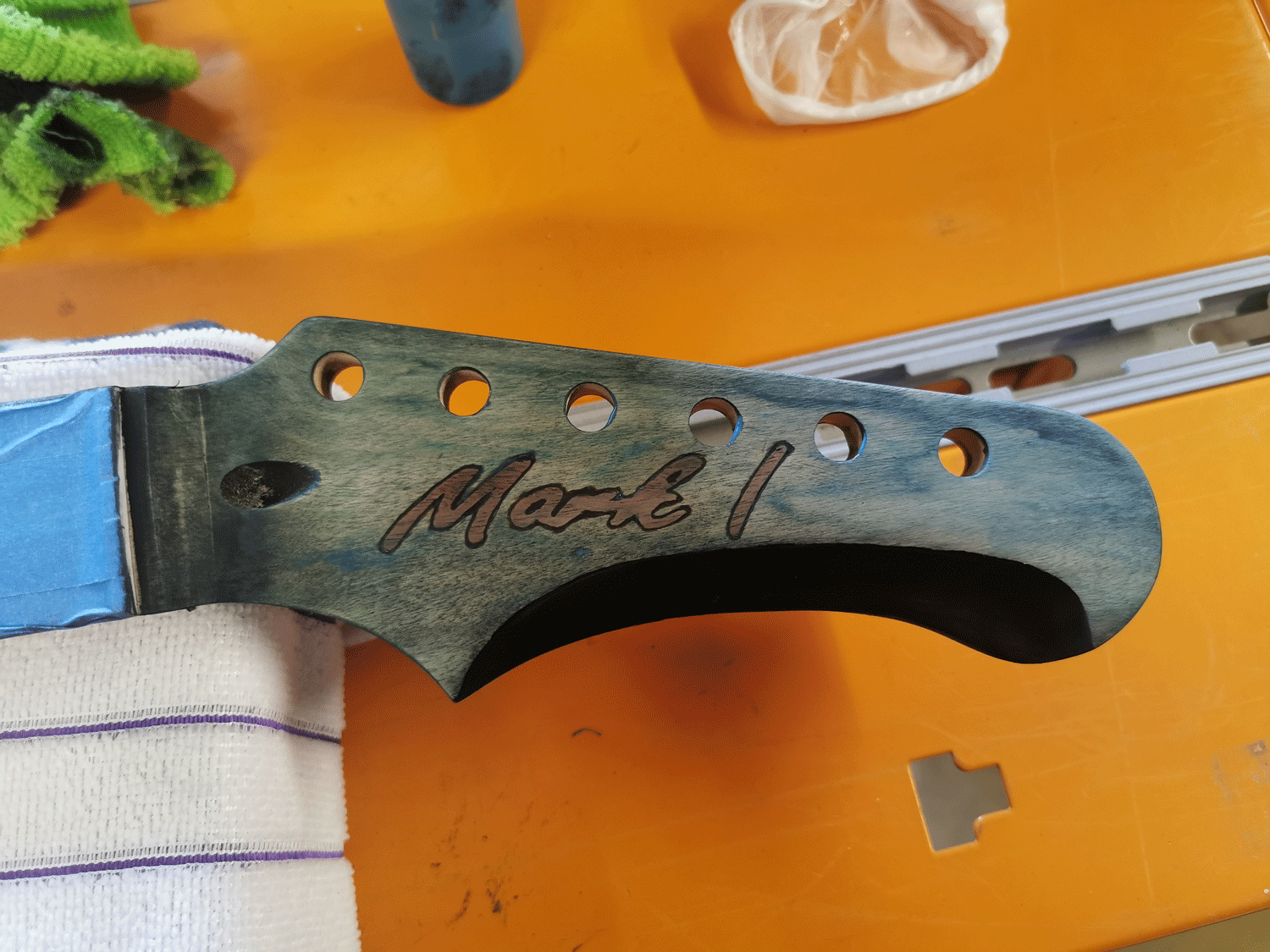 Made some progress on the neck/headstock. Maybe some fiddly work and fine details to complete, but not sure if there's much value to add. In the end it will be what it will be. Headstock is painted up now, I went for a full matte black in the scallop, it should look pretty good with finish on it. I still want to scrape/clean off the inlay to brighten it up a bit.