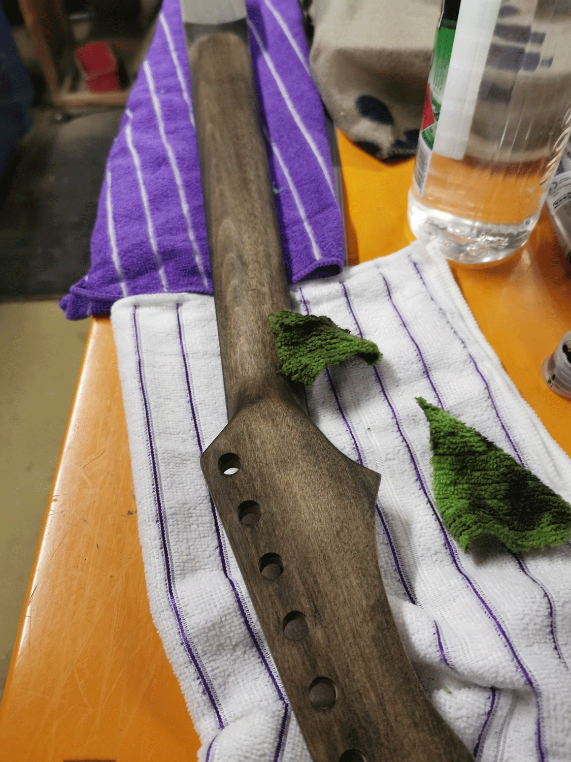 I put down the final coat of wipe on poly for the body. It's gonna need some finessing to get it to look okay after it cures, but I'm pretty happy for a first attempt. Hopefully no sanding through the clear coat...