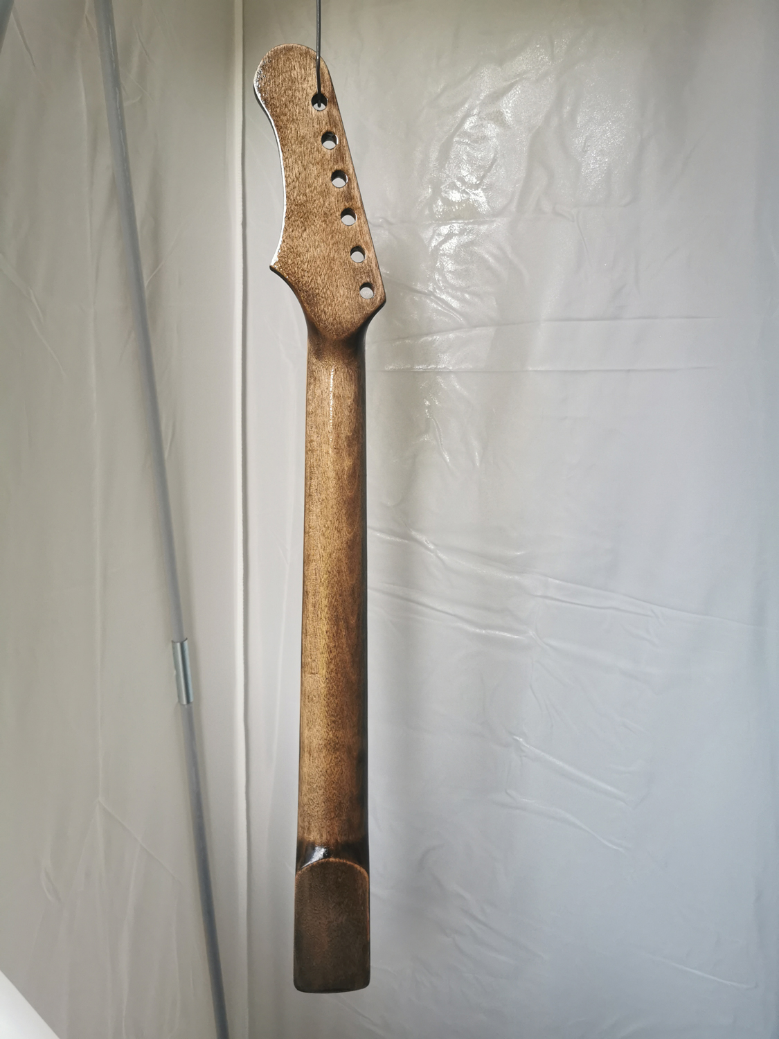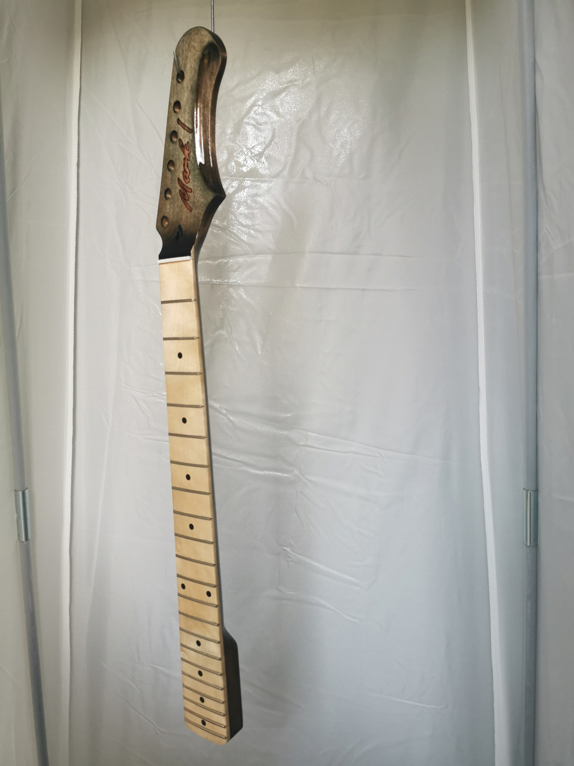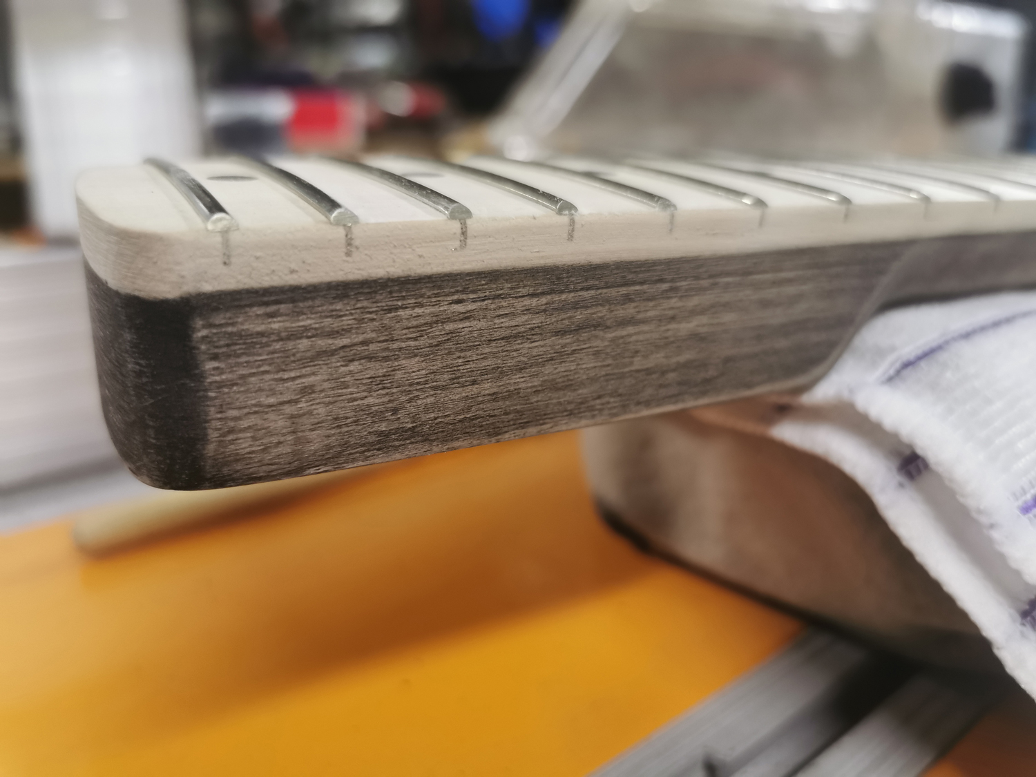 The maple is smoother and less absorbent than the body wood, so less sanding is required to get it flat, but I’d still put 4-6 coats on depending on the coat thickness, probably 6, especially as the neck has been stained. Any sand-through will leave a lighter patch which will be hard to fix in isolation, so it’s either sanding the whole neck down (I did that twice on the Hexacaster) and starting again, or touching up the clear coat and leaving the lighter patch.