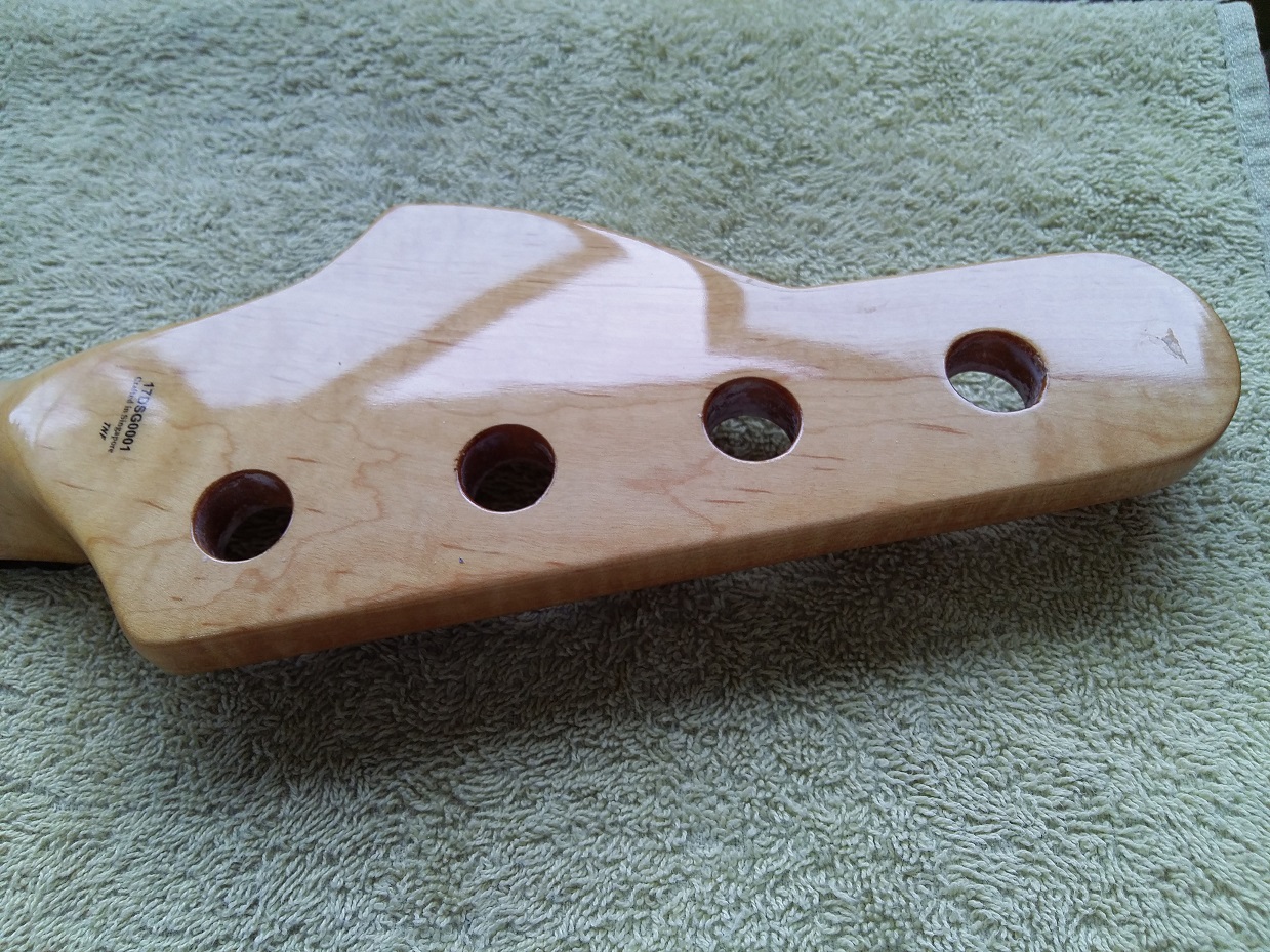 i wanted texture of tru-oil on neck, so i applied 3-4 coat of TO and applied with Urethane water base varnish with brush to build-up thickness on it. finally finished by a few coat of poly urethane spray easily to make flat surface for polishing.
