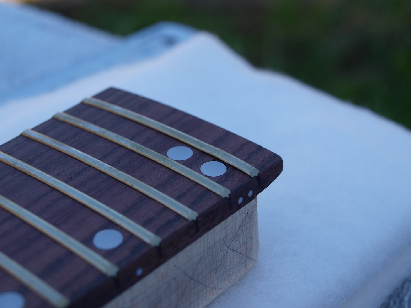 I've also done a bit of clamping on the 12th and 5th frets which had popped up quite a bit. Then had to do a little work on a few others, but in the end the frets are levelled. They still need a polish to remove the tarnish that has appeared on them from being in the garage for a few months. When I got the neck out of the box I thought they were gold frets. Yikes!