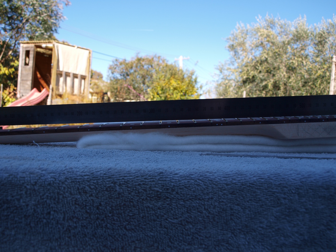 And 'problem' 2 for the neck. I was checking the frets for level, and the whole neck seems to have quite a pronounced back bend. I know this will change once there are strings on it, pulling it back into level. But should I have the board more level to start with? Is it worth adjusting now, or wait til the strings are on?