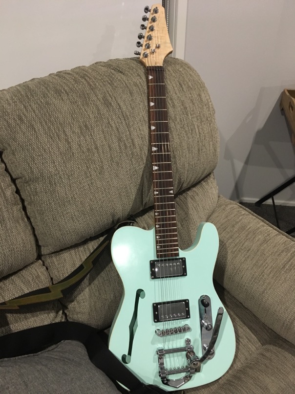It’s not 100% perfect but when I get time I’ll go back and make it so, but spare time is super rare at the moment so I have to make do. The two main problems are (I’ve never owned a bigsby style tremolo before so I could be wrong) the tremolo arm seems to sit pretty high so I’ll probably get a shorter spring. The other problem is I replaced the nut with a Graphtech one and the strings hit the first fret, even with the action at twice what I would normally run at. I didn’t take any off the bottom of it before installing so I’m a bit bummed but I’m sure I’ll be able to work out a shim to get it to a more suitable height. It’s not too bad, the strings just rattle a little on open strings, so I’ll still use it for a song or two, I’ll just make sure the songs have no open chords ;)