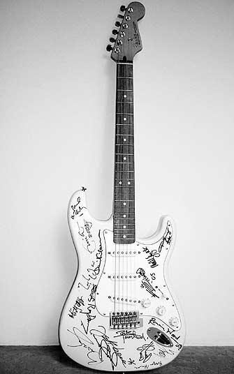 "Reach out to Asia Fender Stratocaster: Sold for $2.7 million In 2005, this guitar was sold in an auction in Qatar to raise funds for Reach Out to Asia, a charity formed to help tsunami victims. The instrument is signed by Mick Jagger, Keith Richards, Eric Clapton, Brian May, Jimmy Page, David Gilmour, Jeff Beck, Pete Townsend, Mark Knopfler, Ray Davis, Liam Gallagher, Ronnie Wood, Tony Iommi, Angus and Malcolm Young, Paul McCartney, Sting, Ritchie Blackmore, Def Leppard and Bryan Adams"