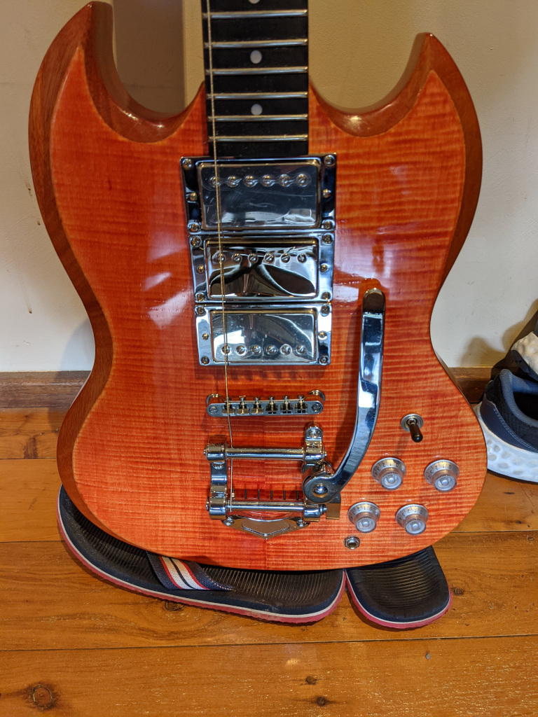 All done and playable. Not as red as I wanted it, but still looks OK. The same stain on the mahogany AGM-3F looks a lot better. Now to gift it to a friend and work on getting the other one finished. Also gives me some room to get cracking on the IB-7 refresh/rebuild.