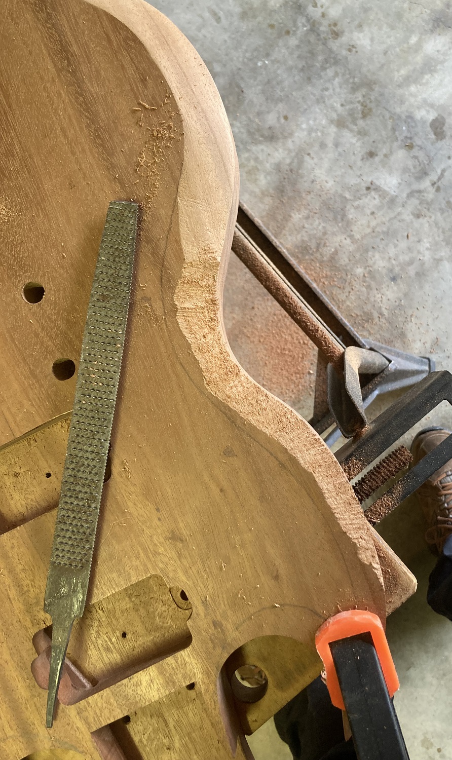I then took to the guitar with the rasp as in the photo, 80 grit and a metal file to smooth it off. Turned out the be the easiest way after trying a number of other tools.
