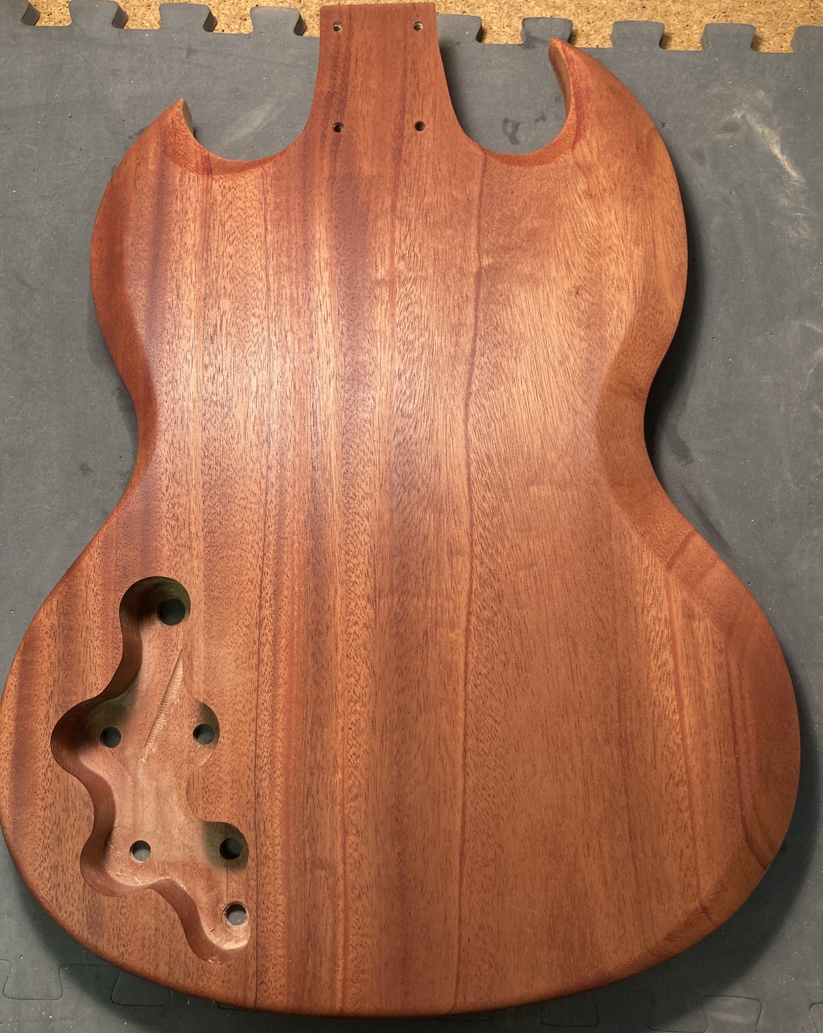 I made this channel to stop the electric drill wandering about. I also added a block of wood in the neck cavity to stop the bit lifting as it went through. My 6mm bit was only going to be 3mm into the base of that cavity.