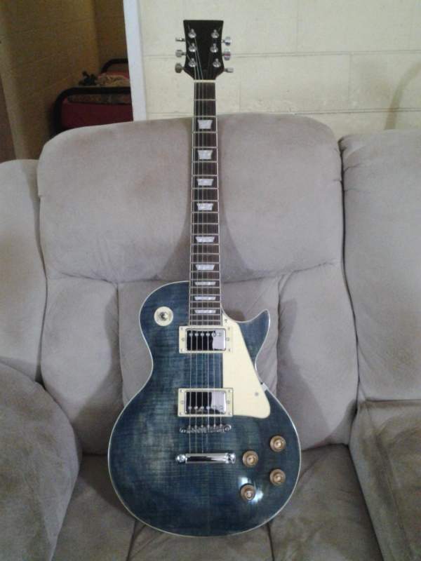 OK here it is... my first build, the LP-1M. Tryed my hand at doing a sort of blue burst on the top of the guitar with a nice mahogany dye on the back. Used Minwax timber dyes for both the blue and mahogany colour. Finished off the guitar with a good 15 coats of Tru-oil. Finish came up so well I didn't bother with cut and polish.