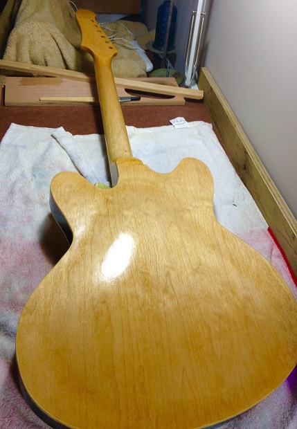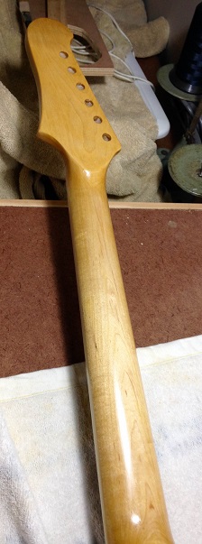 I was applying the 3rd coat of blonde shellac to the neck when I carelessly let a drop of pure meth-spirits fall onto the back of the body. By the time I removed it, the spirits had liquefied and removed all the previous layers in one tiny patch back to bare wood. I now have to match the colour shellac in that area, and re-build the 8+ layers in that one area....sigh....shellac is very very sensitive to it's nemesis...alcohol.