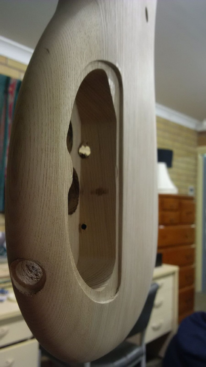 Ok so theres been some progress tonight. Got the recess for the control cover routed...ended up making a template and using a straight bit router. Am very happy with the results!! Also made a recess for the jack to sit in so that's its flush with the body of the guitar. Did this by plugging the hole with some dowel and the used a larger drill bit to make the recess. Pretty simple but seemed to work.