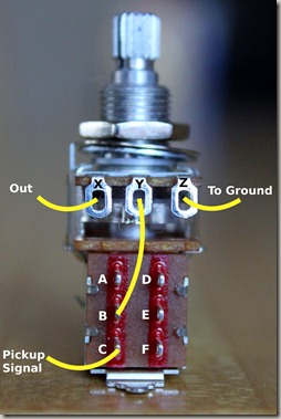 You're just using a single master volume pot so (with the x, y, z from above) you have ground on x, out on y, and pickup/switch/in on z.