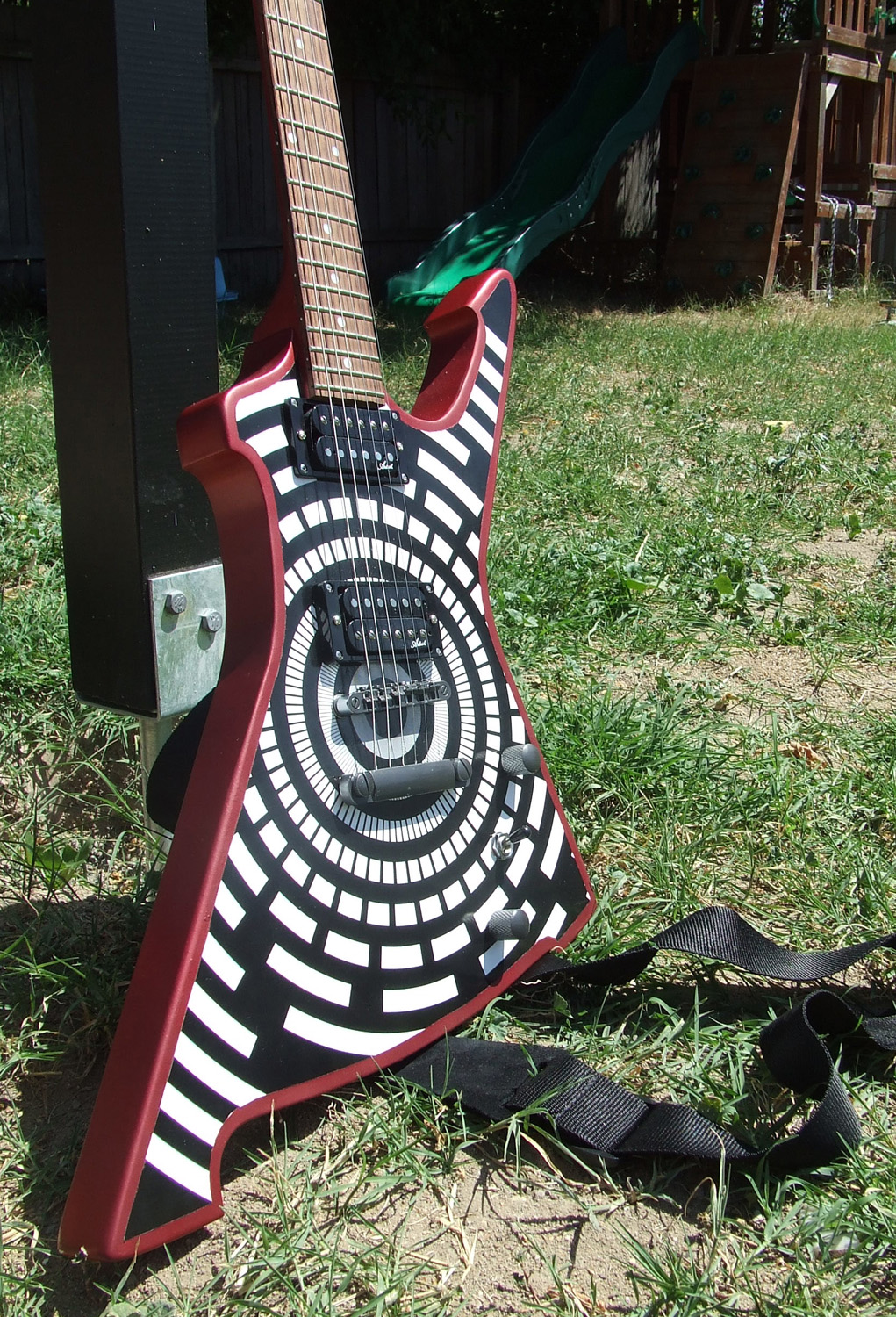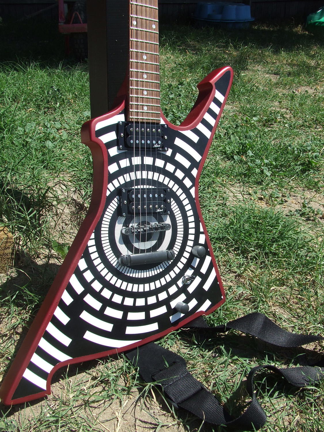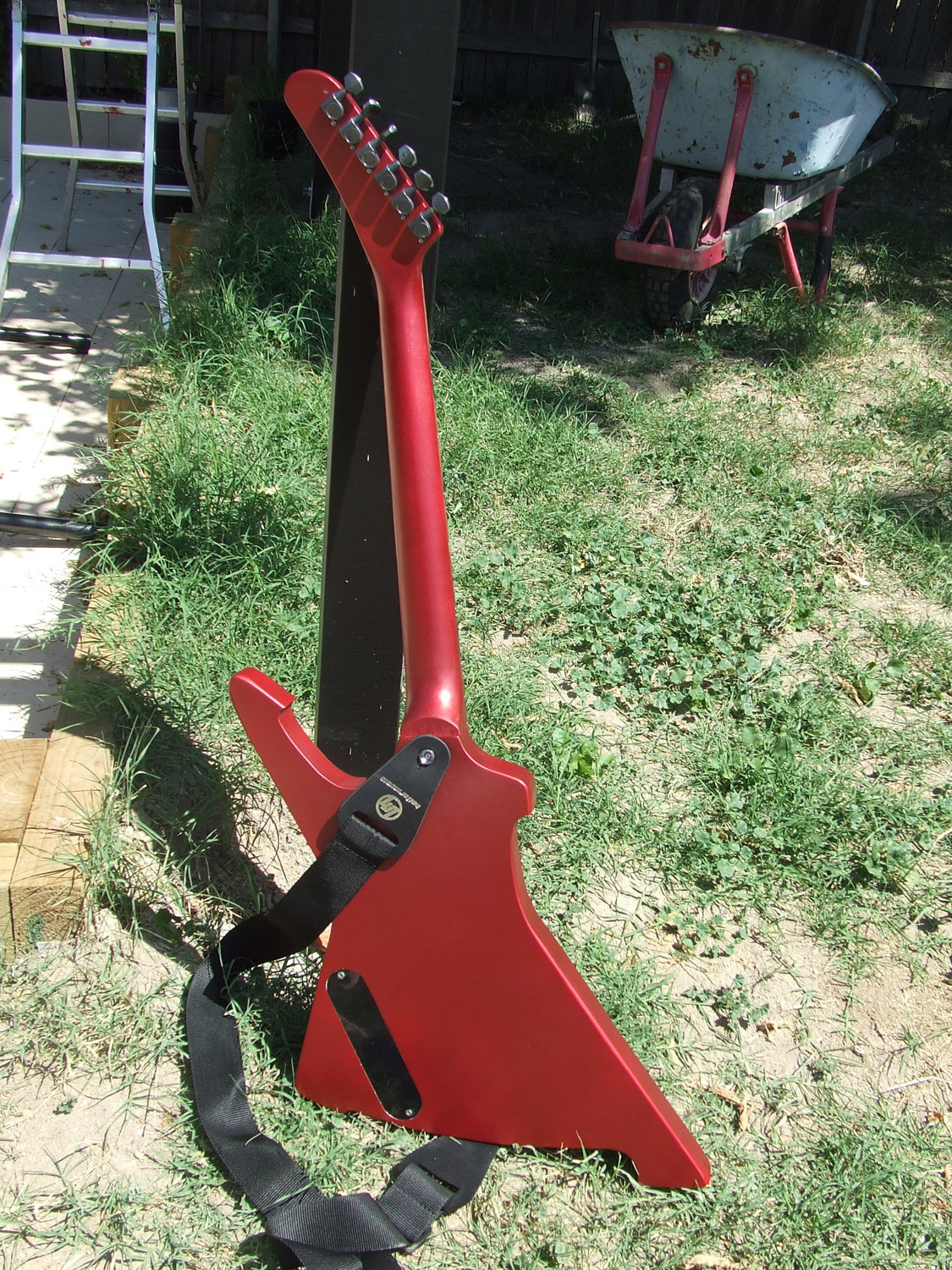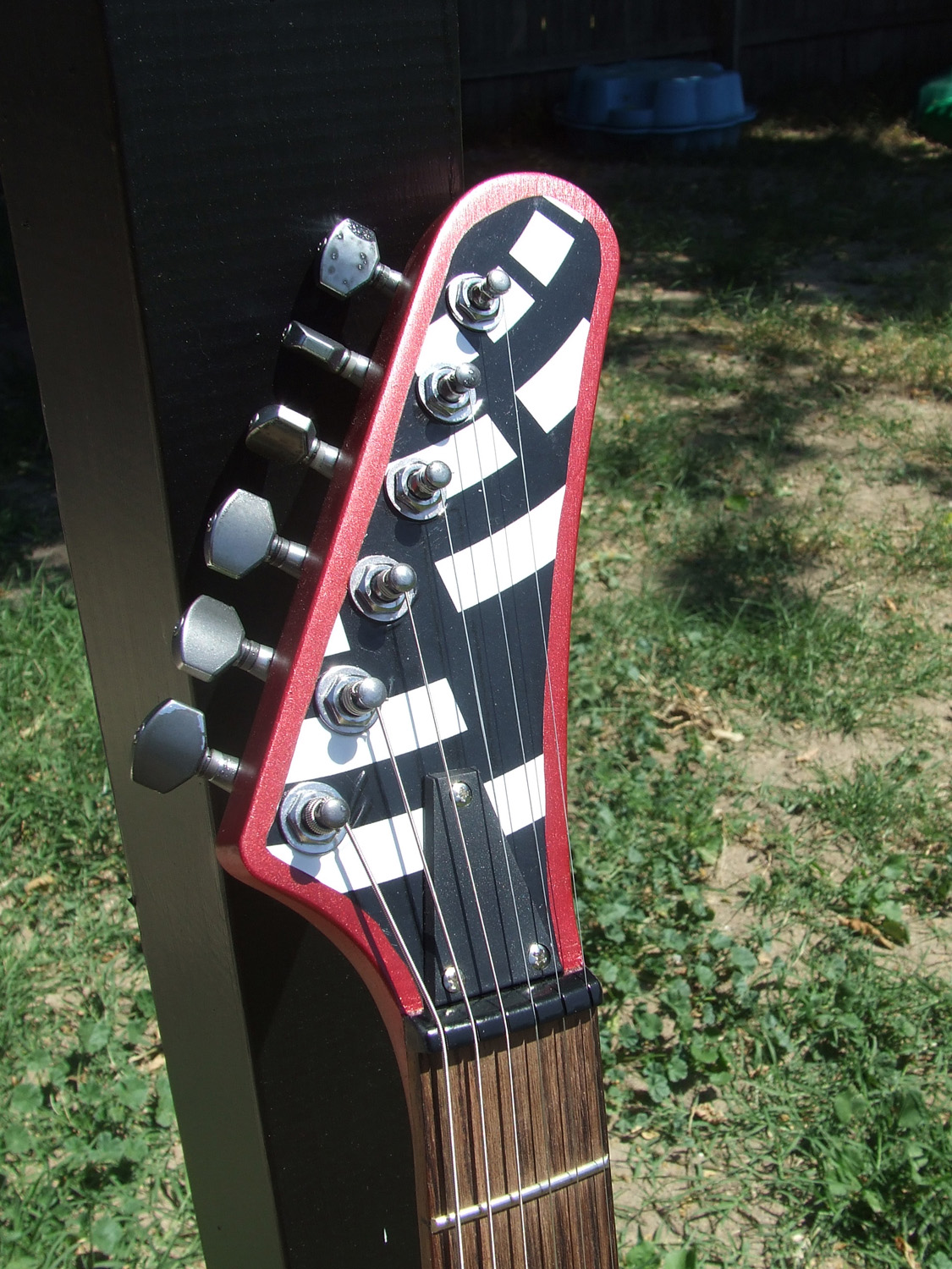So without further ado, I present the Spliceman Mk. 1 (half 'splorer, half Iceman - the first of many). It's a butchered EX-1 kit, with a custom vinyl decal over Duplicolor Empress Red spraypaint. Just about everything is stock - the hardware is chrome, shabbily sprayed with a translucent grey the only upgrade was to put in some Artist Bullbuckers (chinese JB/Jazz neck clones).