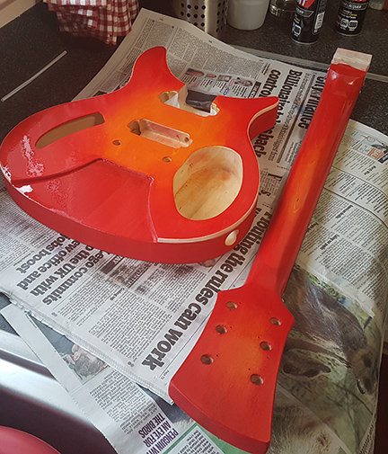 Finish sequence is really up to you. I'm doing all the colour work on mine before gluing, touching up the join lines and then applying the clear coats on the complete guitar. Though there's nothing to stop you applying clear coats on the separate parts, then gluing and then doing some clear coats just on the join areas.