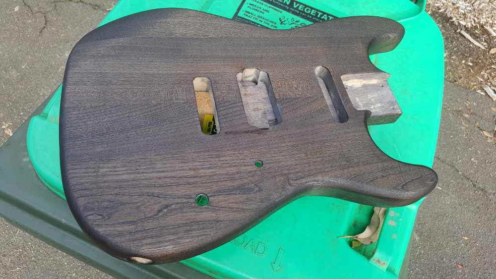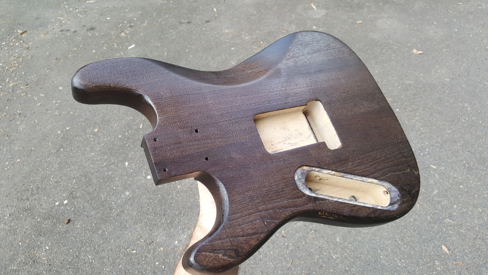 I *may* chuck some Colortone dye into the next TO coat to darken the black a smidge, but I'm undecided. It's well past time I get started on the neck. I still have to cut the headstock shape, so hopefully I'll find more time this weekend to get that done.