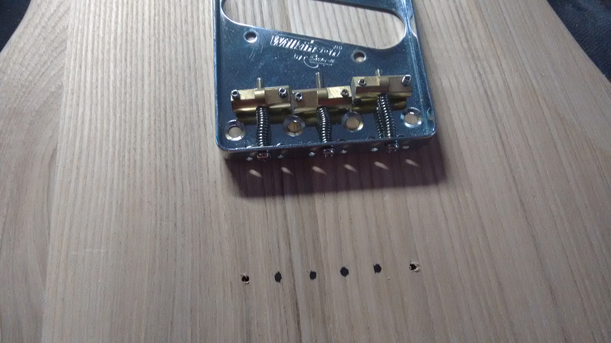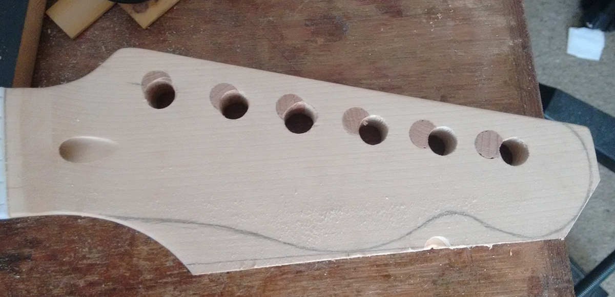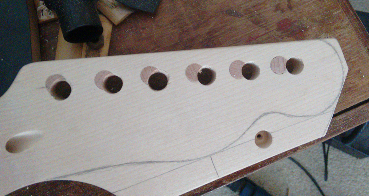 Well continuing on.Attachment 25108bridge and string through holesAttachment 25109string through holes (back)Attachment 25110Tuner is too close to the edge. Due mainly to this I've decided to ditch the 'vintage' tuners and use the kit ones.