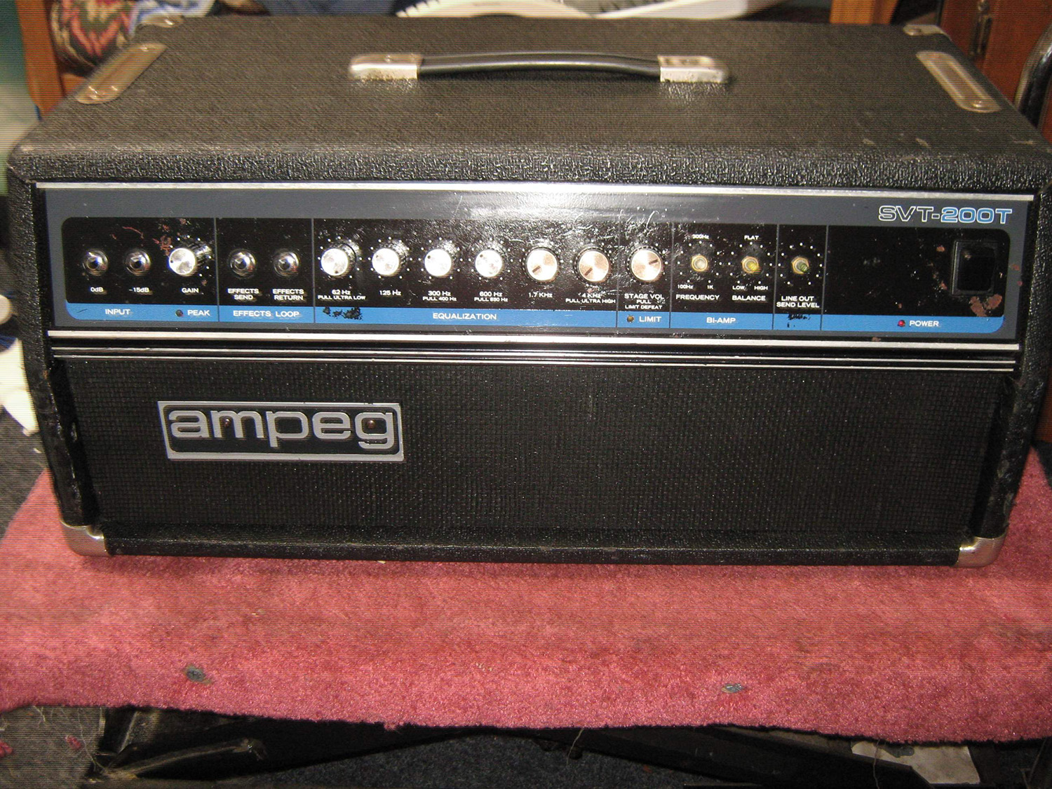 First picture (the outside one)? Not 100% sure but from the control layout it looks like an SVT-200T, the version with the blue stripe under the controls (there was a version of this amp with white 'boxes' around each control section). 200W transistor amp.
