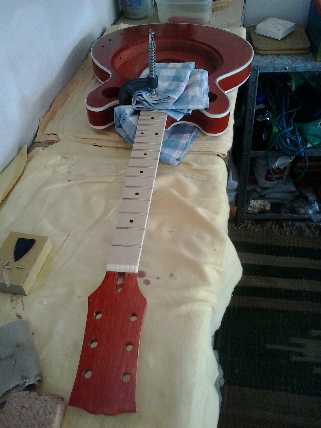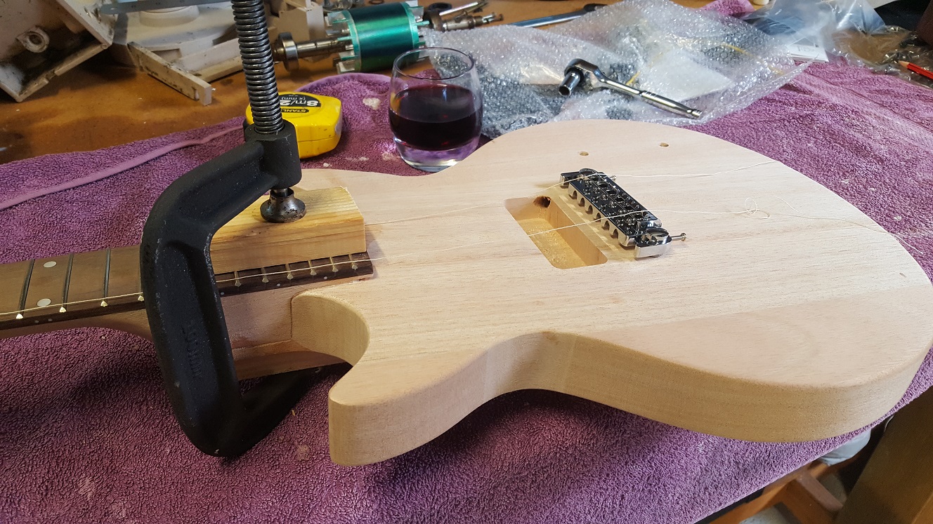 With 3 set necks behind me now I have a feeling that clamp position can change the desired number of degrees + or - enough to result in high or low action. When I set the last one I fitted two tuners and the bridge, ran cotton on E and e. Moved the clamp to get desired clearance at the high frets. I've had one build too low, had to cut the bridge into the body, one too high, had to sink the cone and this one just as it should be.