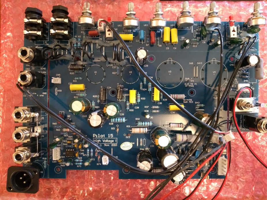 All the pots and sockets for the front of the amp are mounted to a perforated section of the circuit board, which is joined to the main board by a bunch of really short leads.