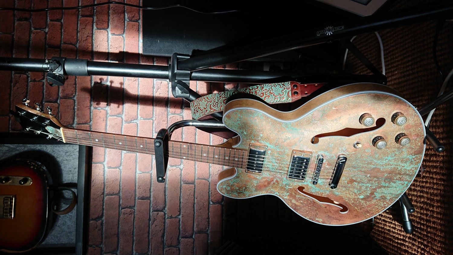 Love the looks of this guitar! Aged patina on the copper and the strap really work well… Nice attention to detail with the truss rod cover and binding on the headstock as well… Back and sides do the top justice and stay out of the way to some extent and give the front a chance to shine. Love the work!