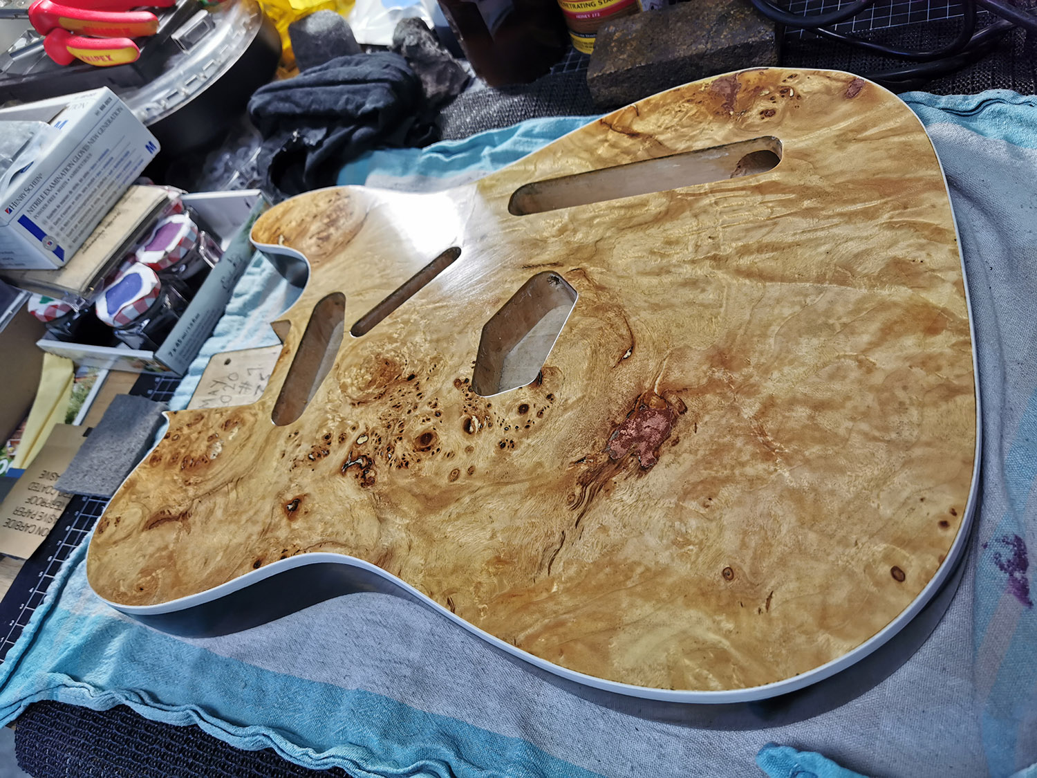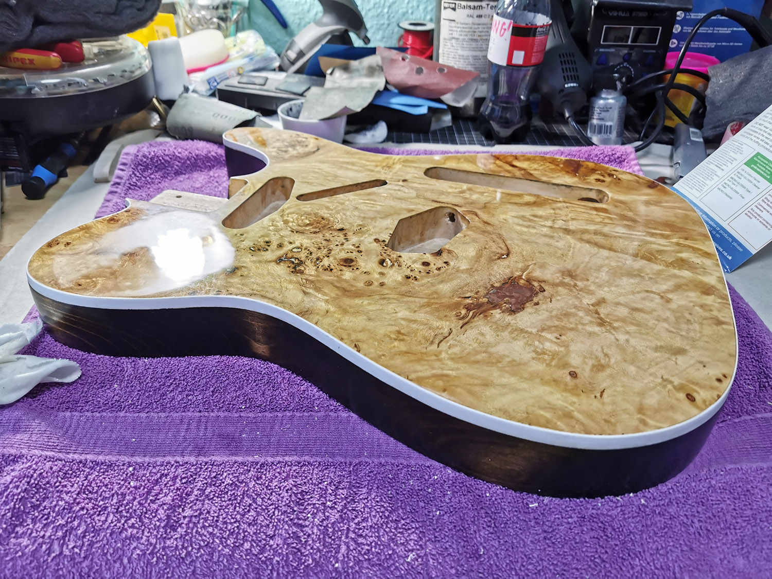 So yeah, after almost 2 months to the day, I put it together yesterday. I had a lot of trouble with the tru oil in one specific part of the guitar, where tiny spots would break out again when gently sanding or even when accidentally scraping it lightly with my finger nail. I got around it by filling these spots with super glue and then adding tru oil on top. I think the tru oil didn't like the glue that was used to fix a broken spot in the veneer, but as it was done by the factory, I have no idea what glue that is...