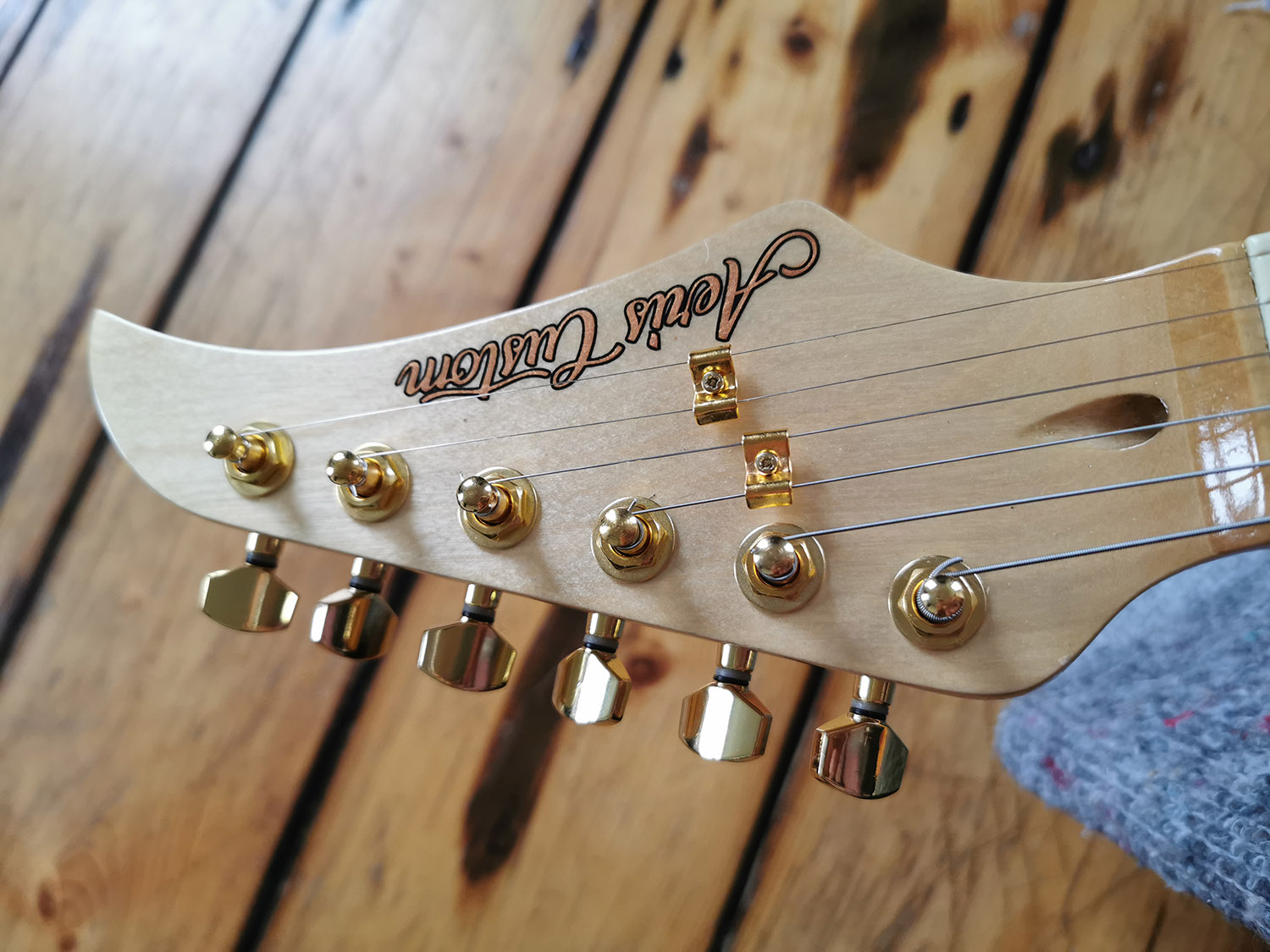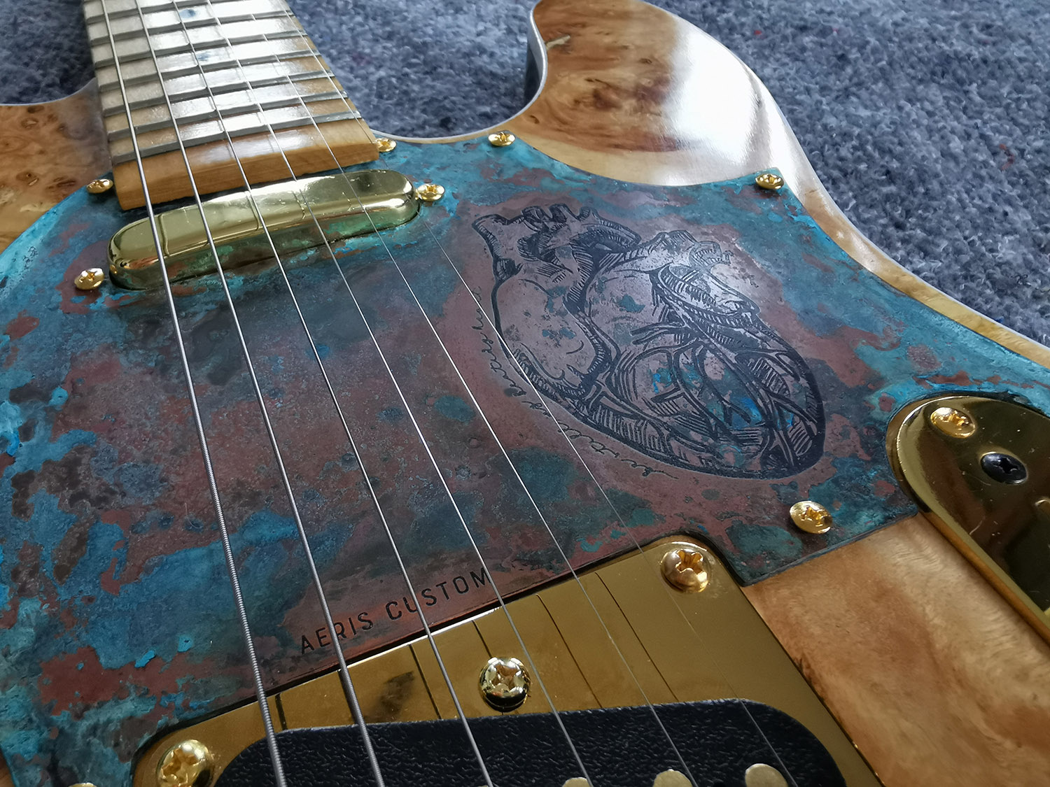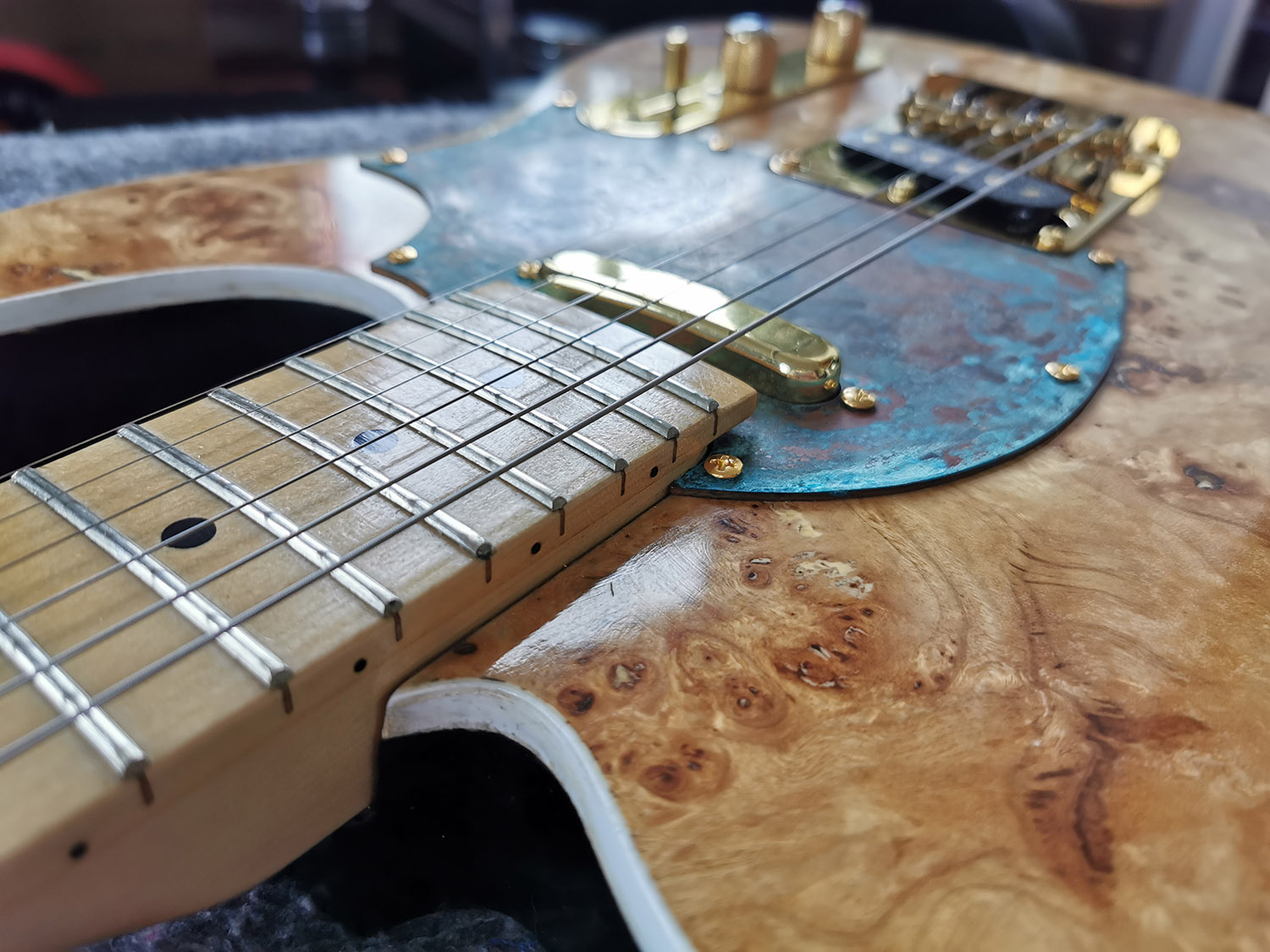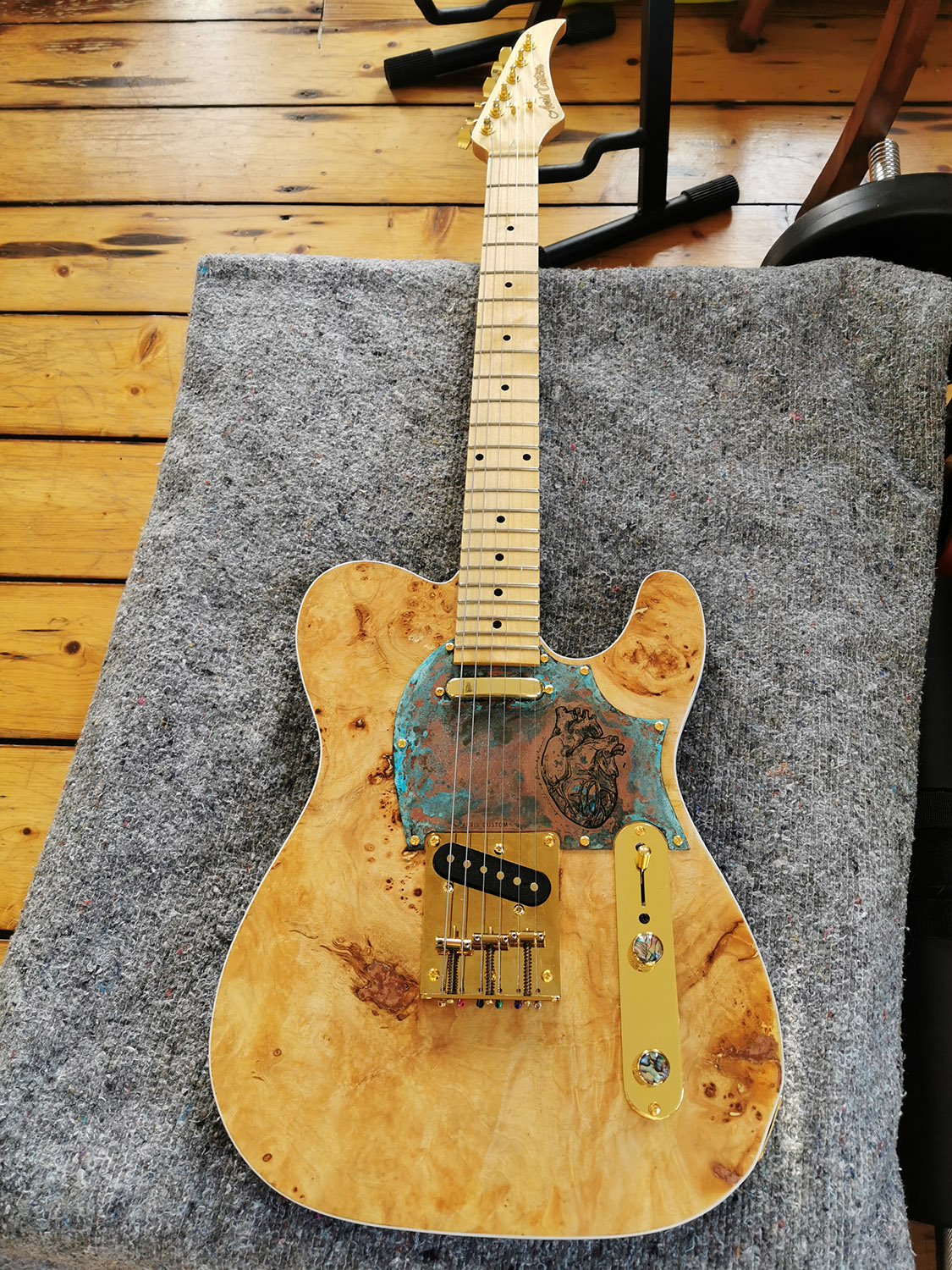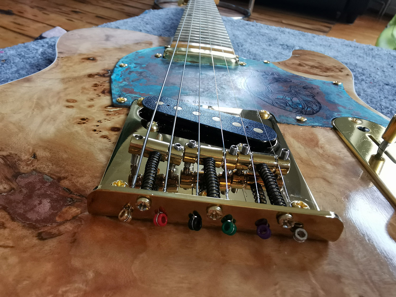 The customised pickguard (whilst I'm not a steampunker :p) looks great and the abalone top dome knobs work really well with whole colour scheme.