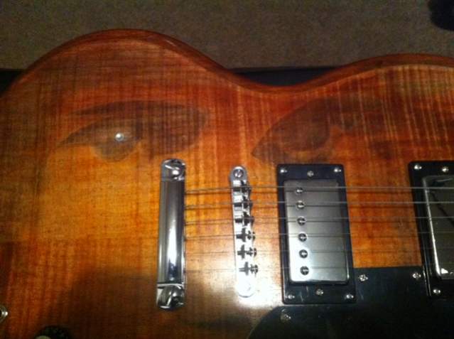 I stuck a diamente thingy in one of the eyes, attached the strap and put the cover on the truss rod hole in the headstock