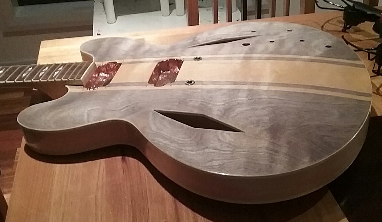been over 6 months since this one was finished and the clear coats had never set it was still tacky and soft to the point were hairs from my fore arm where sticking to the guitar. So while i was finishing the grs i decided to sand it back and re clear coat, it diddent really sand of but rubbed of in little balls