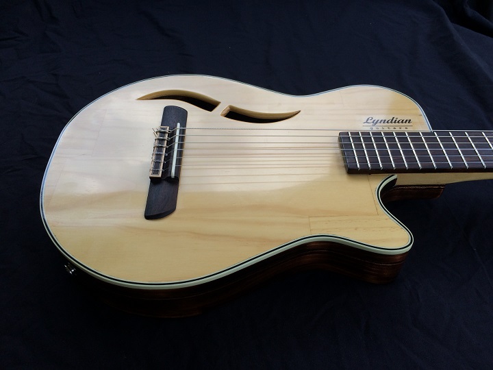 Lovely bit of work Robin, that central ply core of the neck has created a wonderful accent to the whole look. The easy access neck/body transition is wonderful and in itself visually stunning, as is the stylised soundhole/F hole execution.