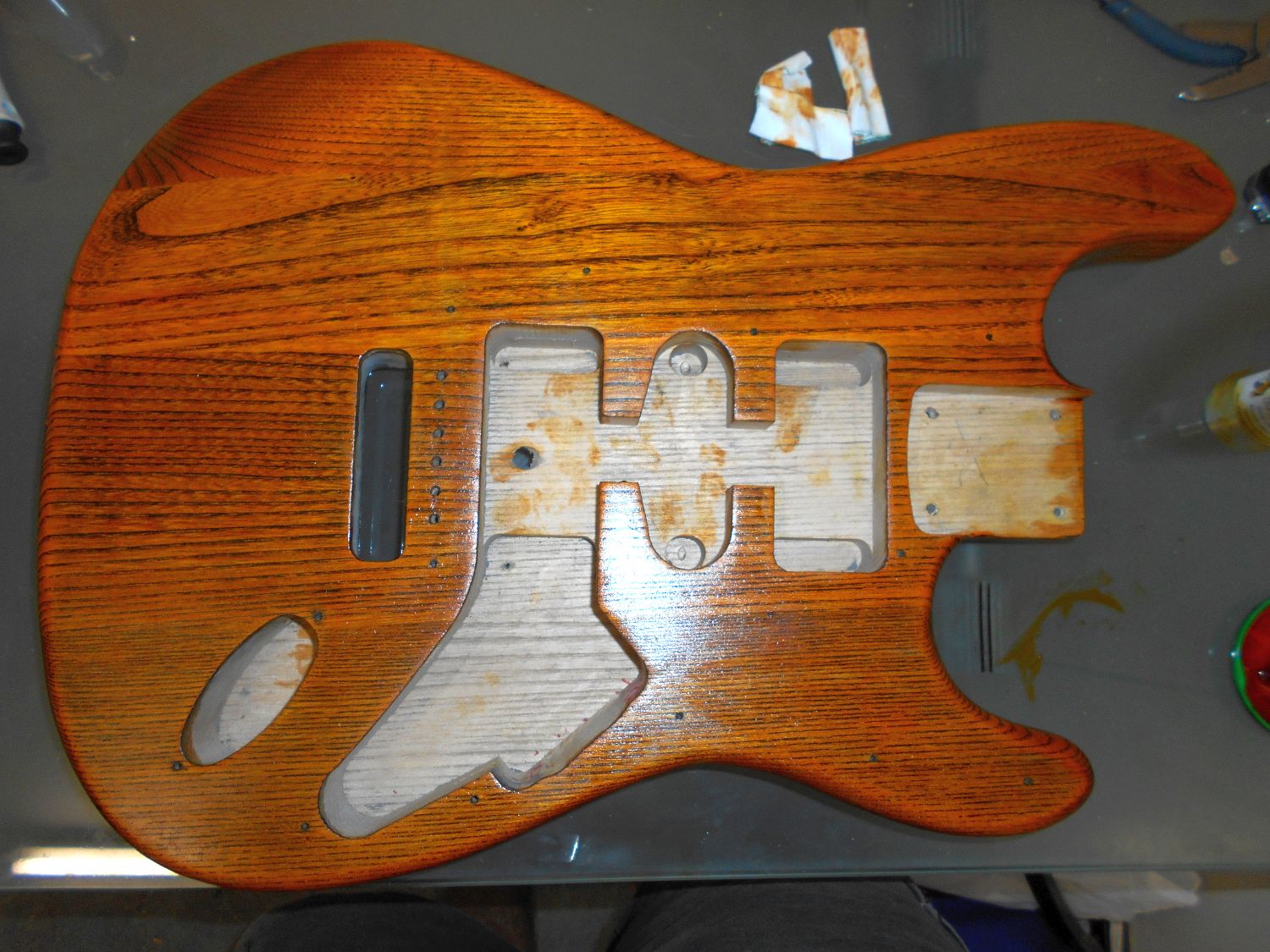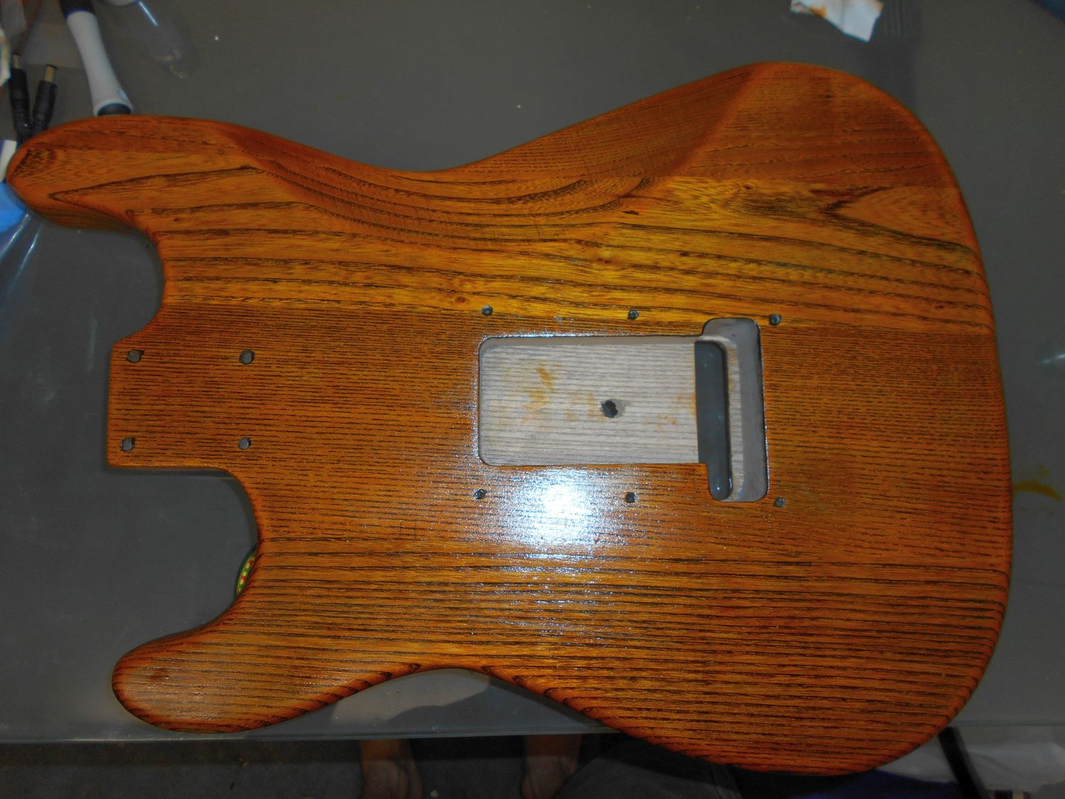 might be best to stain the back first, then the front and make up a jig with wood blocks so it rests inside the control cavity and hence bare wood