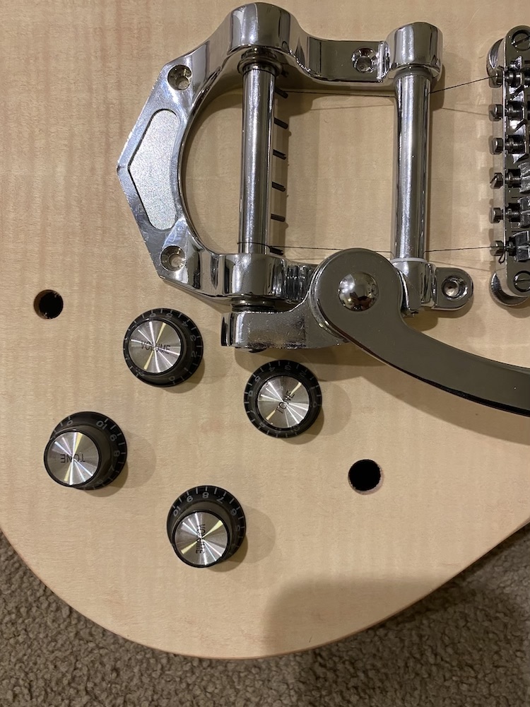 It does rather look like the kit controls are higher up on the body than on a real SG, limiting the Bigsby location. Unless you abandoned the flame top and went for a solid paint colour, then there isn't a viable option for filling the existing control holes and redrilling them further down.