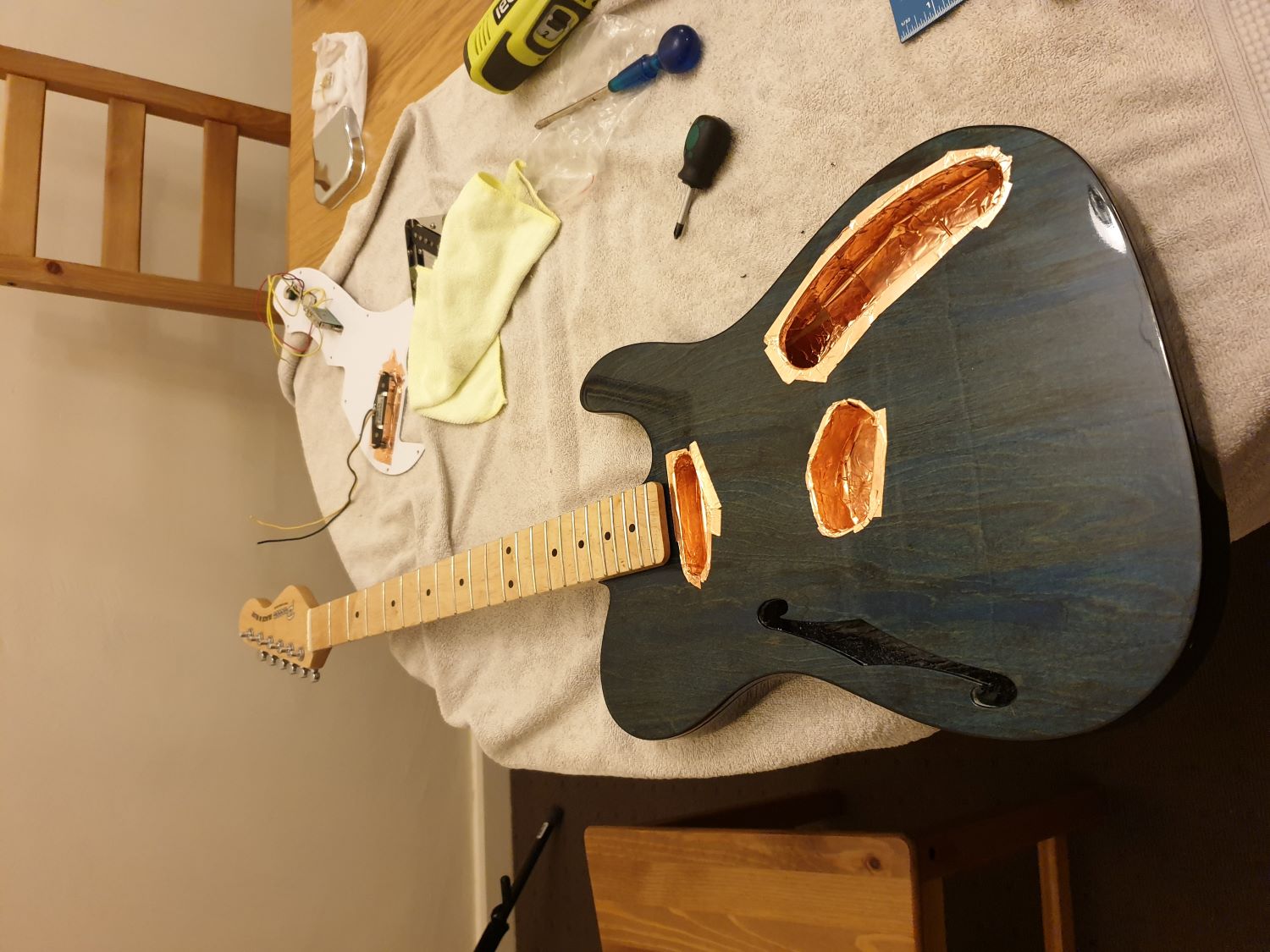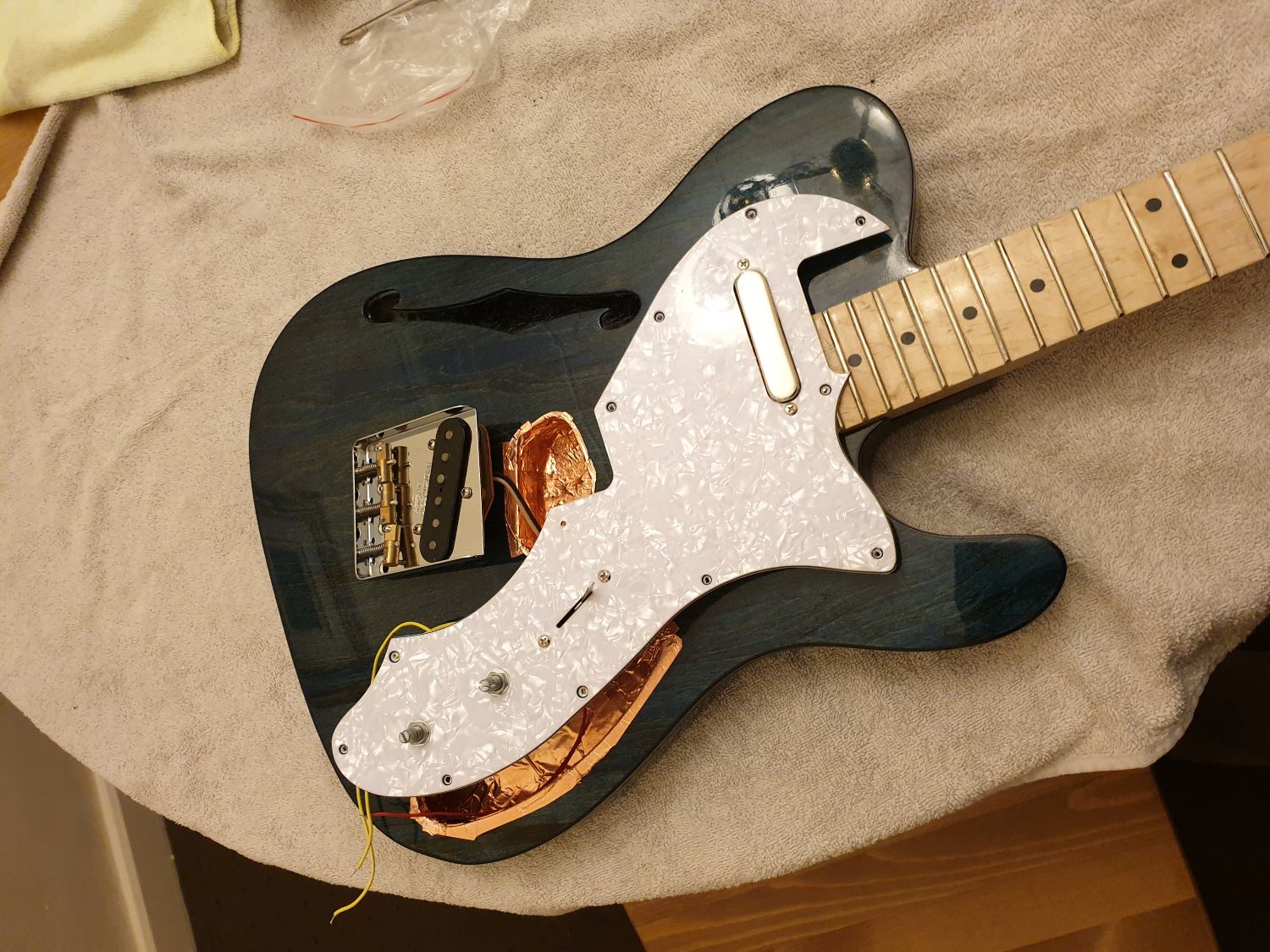 Little bit of copper shielding ... found hard to get into a thinline semi-hollow body, but final product seems ok.