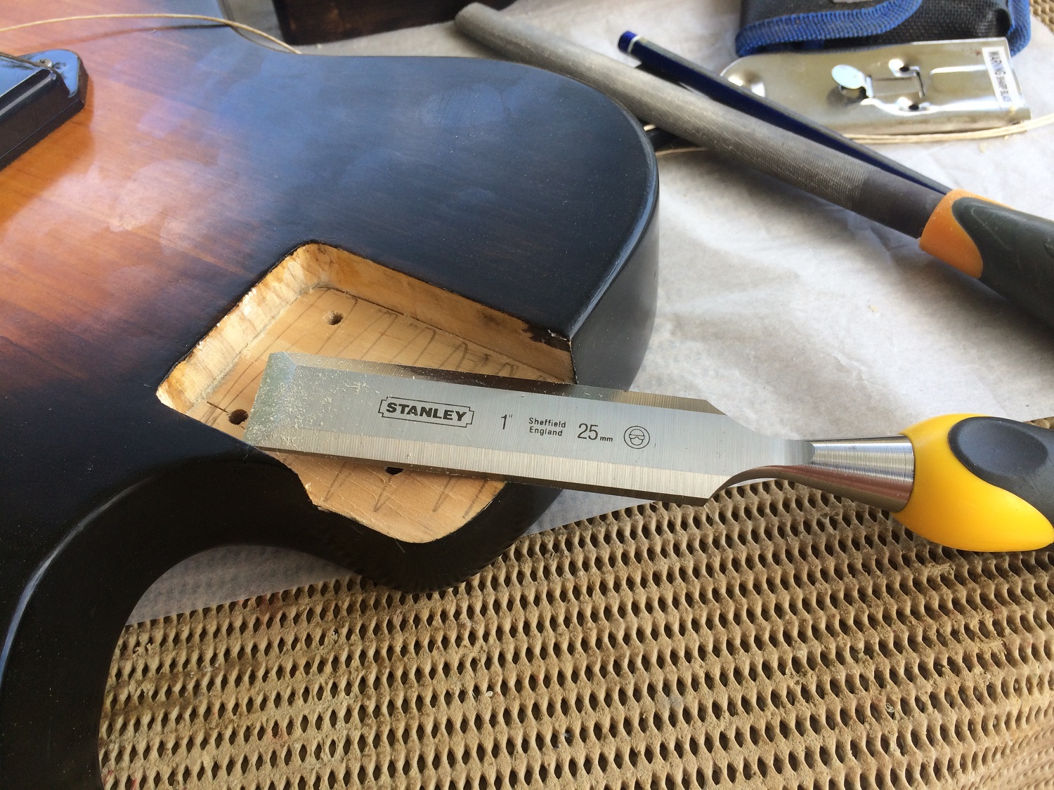 Unfortunately, like nearly everything else with this guitar I got it wrong. Not sure what the angle ended up, but it is now too shallow and even with the bridge all the way down the action is a little too high. I’ll use it for a while like it is but I will need to take the neck off again and adjust the angle so that I have the action I was after.