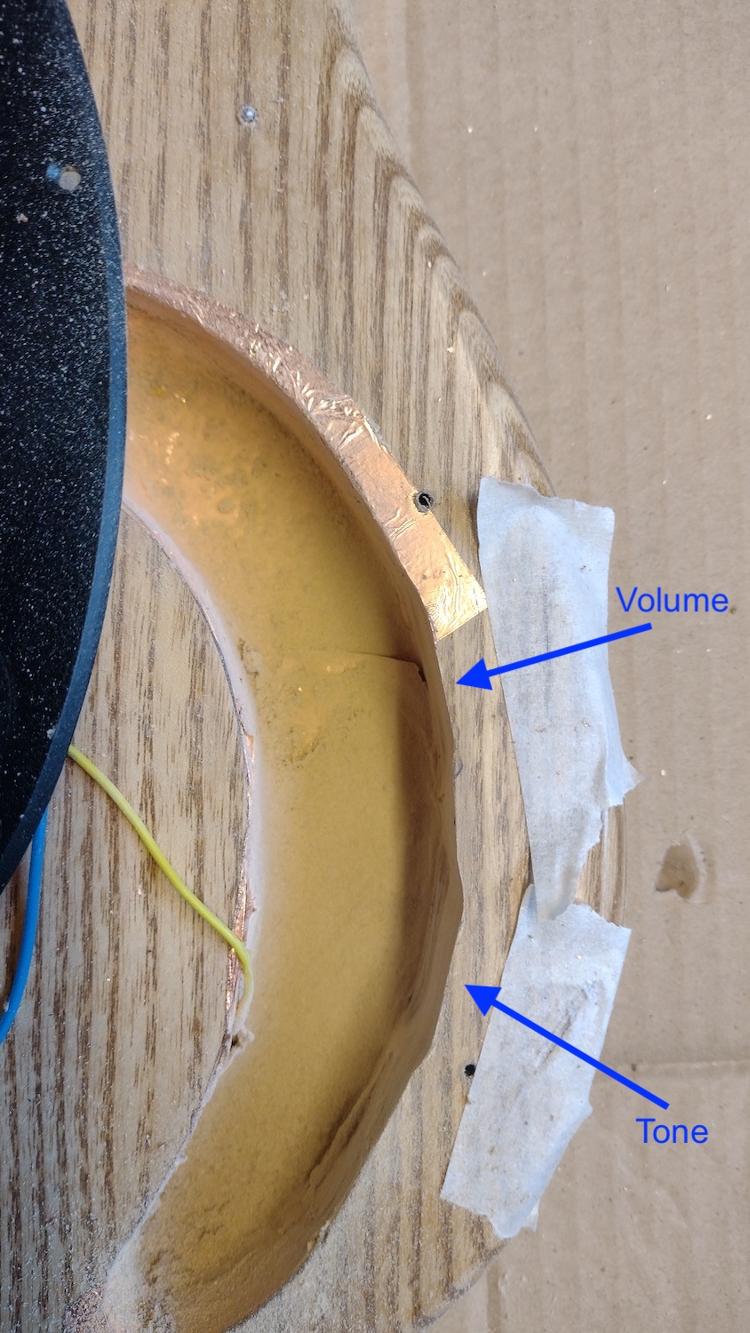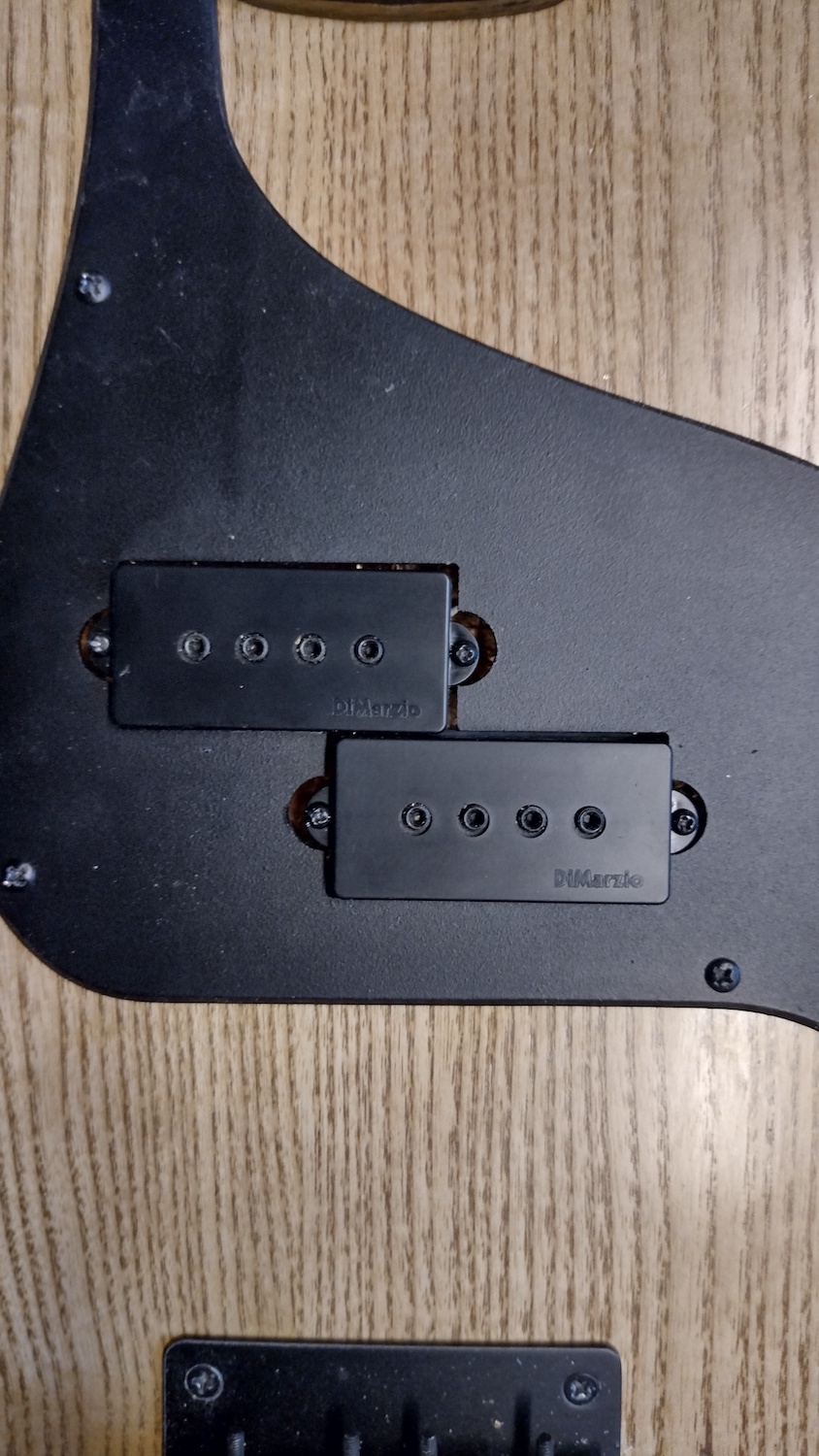 The DiMarzio pickups are slightly smaller, so I had first to patch the existing holes that I drilled for the kit pickups, and then I finally drilled the holes for the new ones.