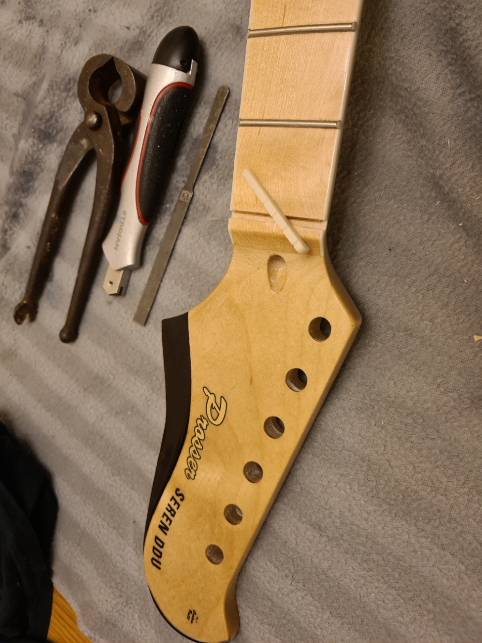 Finally got around to returning to this build having waited for Grover tuners which I didnt realise had not been delivered with original order (whoops - after 12 months). Sat down to install hardware. Started with bridge posts and and ...