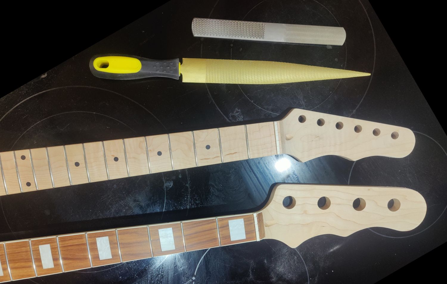 I have always used a router to do headstocks in the past…and the last time I nearly botched the whole thing. I went about it differently this time. I used a jig saw to get big chunks of wood out of the way, then the rasps to get close to the pattern I had drawn. The courser rasps (the Shinto and the small rasp in the pic) worked better than the golden rasp for this since I did not need precision and they removed wood faster. I used a 2” drum sander in the drill press on the slowest setting to get the final shape. Worked well enough that I wondered why I hadn’t done it that way before ;-)