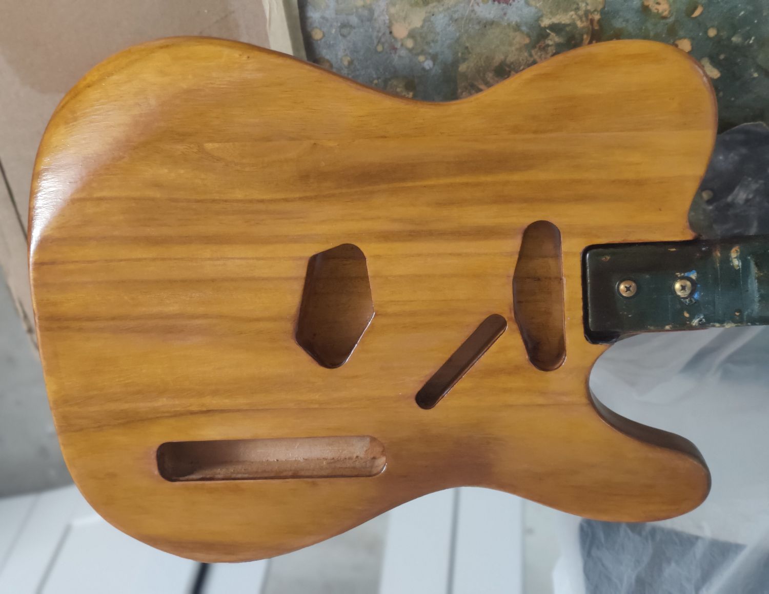 I also finally got around to re-contouring the neck. This was one of the last of the old Pitbull tele necks. I wanted to take a crack at getting it slimmed down a bit. I like the feel of the my Warmoth Strat neck but it is really thin at the 1st fret (.8” or 20.3mm). I thought it would be dangerous to get it that thin, but decided to go after a modern V contour. Fender’s published stats for this are .85 at the 1st fret and .89 at the 12th. Using mostly just the golden rasp (I used the smaller rasp as well, but it was a bit too course and short), I was able to get it pretty close.