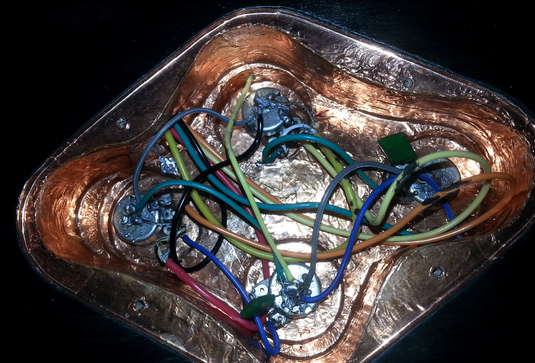 Putting a little bit of electrical tape (insulating tape) under the pot lugs so they can't touch the copper shielding may help to reduce the chance of any shorts. Pot lugs shorting onto copper shielding can easily happen when you have recessed pot holes in the cavity, like on your kit.