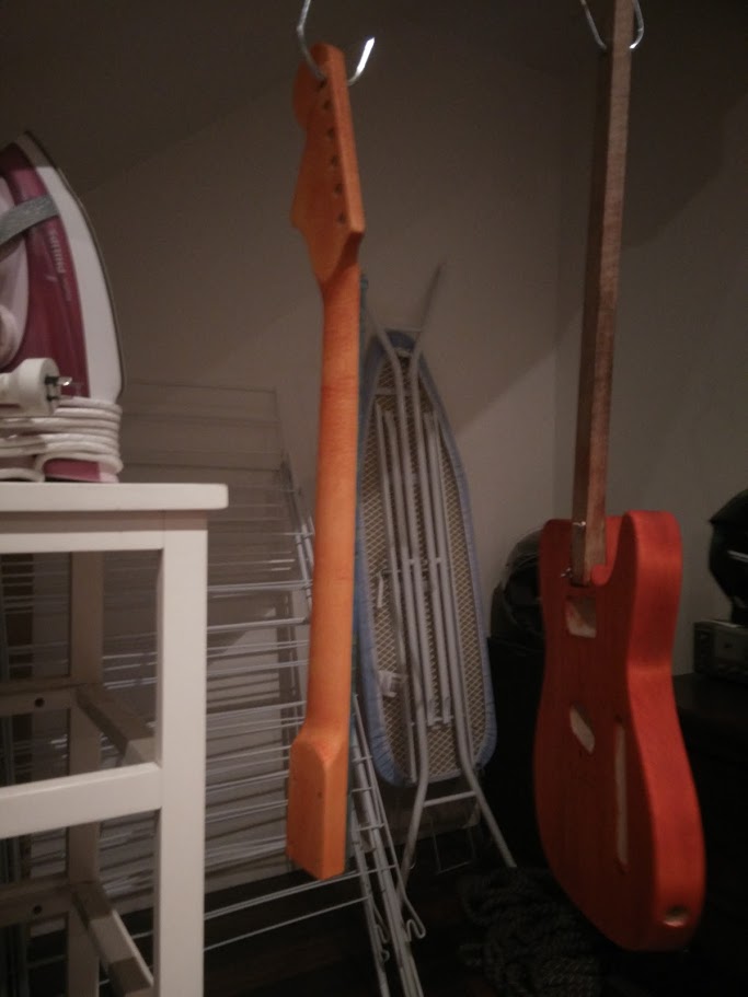 I initially wanted a butterscotch neck, but then thought I'd take a gamble on some other dingotone stain and see what pops out. I went with Bloodwood. Initially came out a bit darker than I had in mind but it's growing on me.