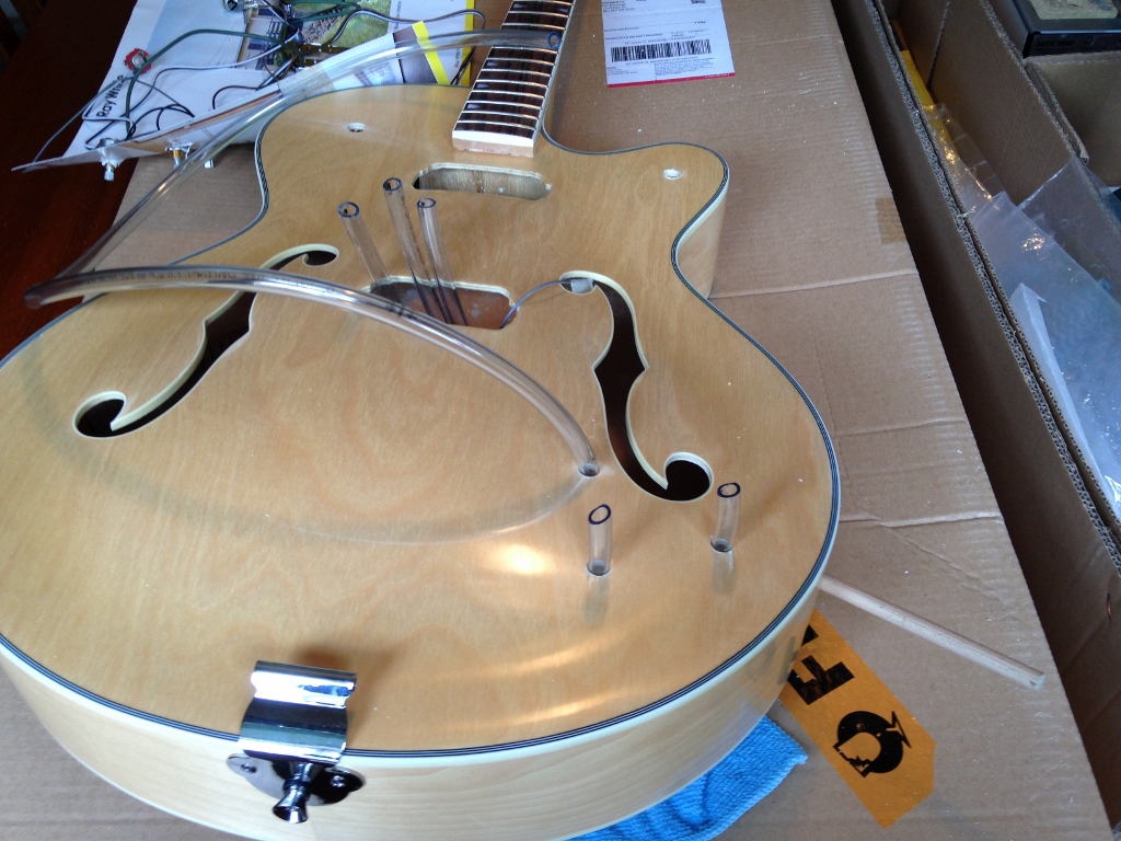 Strings arrived Wednesday, pickup mount bits arrived Thursday. Thursday evening spent attaching bits. Getting close now. Minor adjustments to saddle for intonation.