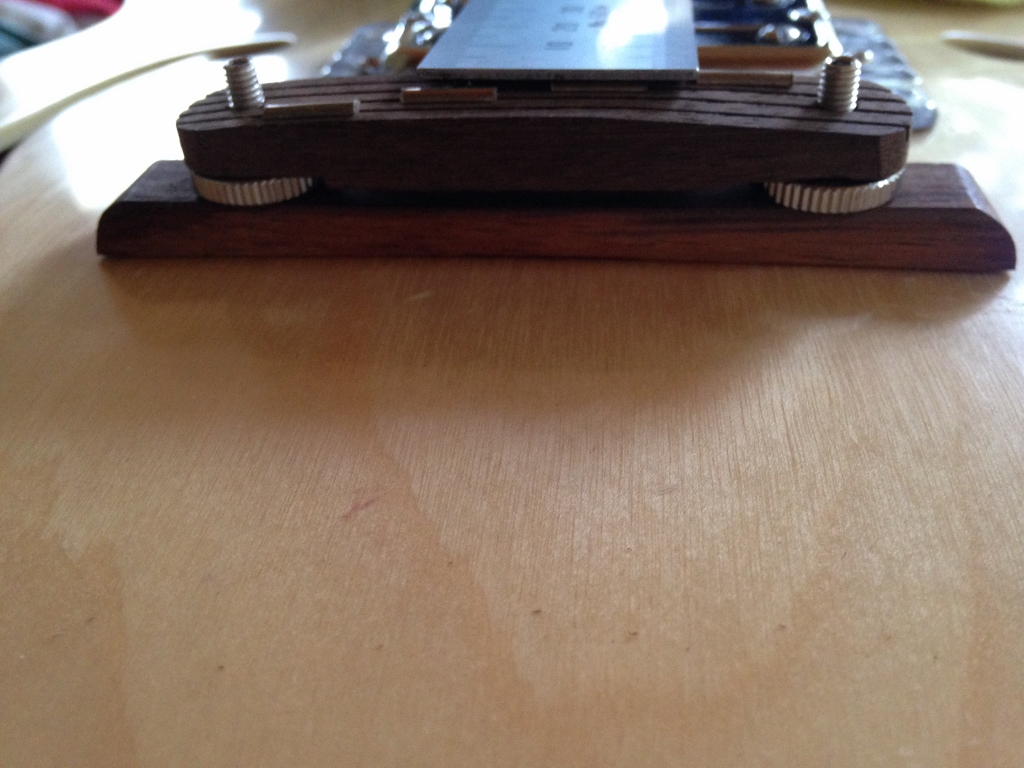 The tailpiece has a slight lean to it, placing the strings off centre. Tried adjusting the nuts on the trapeze bridge. Tried bending the mounting bracket. No good, not enough. Too late now to start doing a bodged up job. After thought and trial and error, I placed a flat washer under the mounting bracket under the left hand screw. Lined up perfectly.