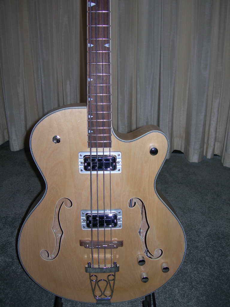 Time to wire it up. I placed a piece of stiff paper over the guitar top and carefully felt where the holes are, pushing a pencil through to give me a template of the component locations. Then positioned the components through the holes in the paper. Then sorted out the wires that came with the kit for best fit. There is no consistent colour coding with the wires, but tried to keep black to earth, white live as much as I could. Soldered wires to components, threaded earth wire from tailpiece to control cavity. I found this web link VERY useful: https://www.youtube.com/watch?v=jxr9E56qyjg parts 1 and 2. Bought tubing and dowel from hardware shop $8 well spent and reusable, as I found out later. Followed video instructions and they worked a treat. Here I encountered a problem with the wires. They regularly broke off at the solder joint. Note to self: use your own better quality wire to build the harness. Also, allow plenty of extra length. Wired up and now start trouble shooting. There was lots of hum that rolled off with the tone knob. This was the first time I found broken earth wire. Pull out offending pot and resolder. Not easy in a hollowbody. Luckily was the tone pot so close to f hole. re assemble. No output. Broken wire number two remove tone pot, etc. Broken wire number 3, live to output jack. remove, etc, replace. I added length to a couple of wires and taped them together for stability when manouvering. All is in now and working hopefully it will not need to be disturbed again. I also eliminated the hum by throwing away the lead cable that came with the kit and used a quality cable. I am thinking I will not bother with the strings that came with it either. I am accumulating enough surplus parts to build another bass!