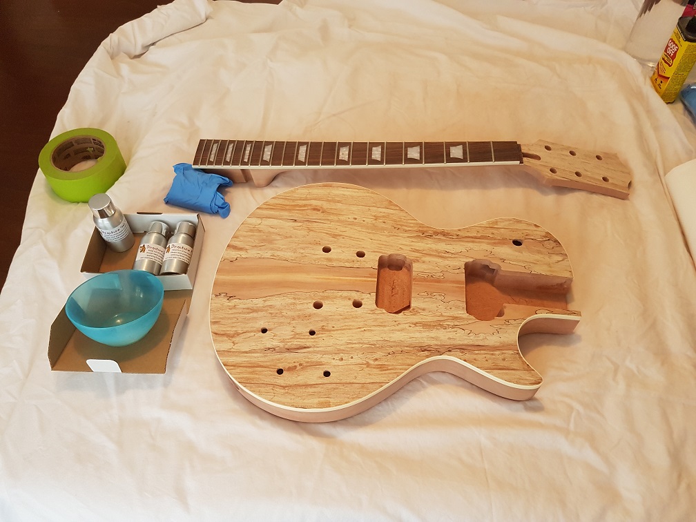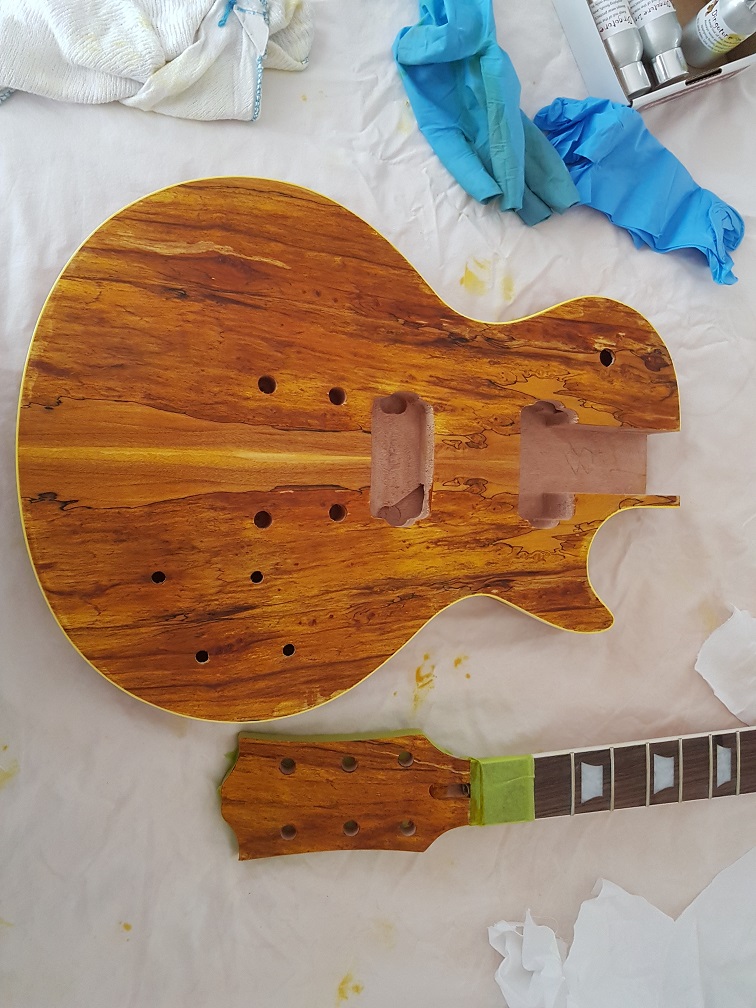 Its amazing how adding some colour shows up imperfections. quite a few little holes/gaps in the veneer that I hadn't noticed, and some glue that I thought I had gotten rid of with a combination of goo off and 400 grit. Was a bit worried about going through, but obviously should have gone a little bit harder. Oh well no guitar of the month for me this time, maybe the tele I do next, or the 335 after that or the.......:-)