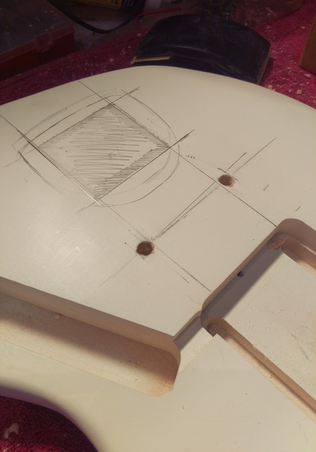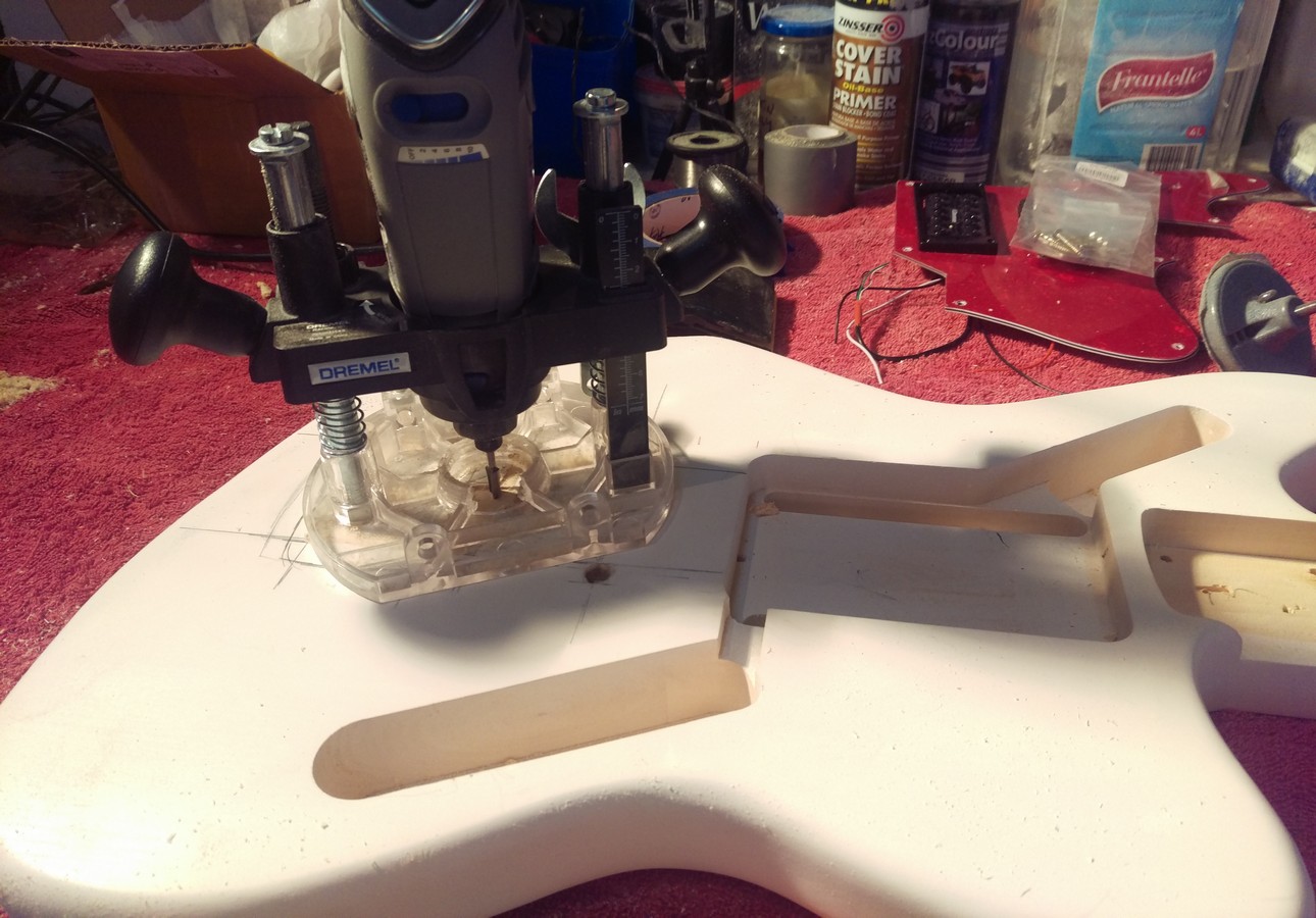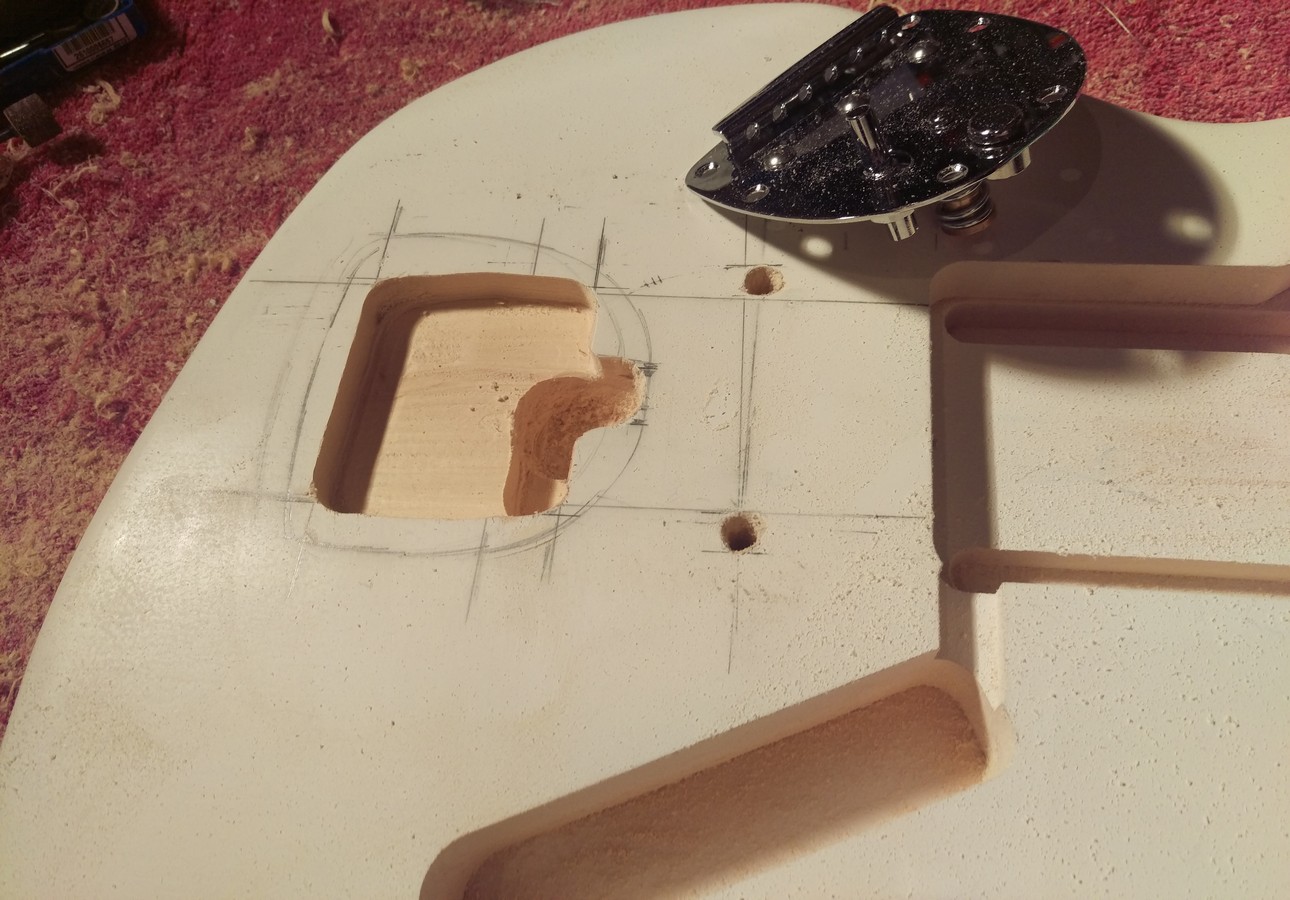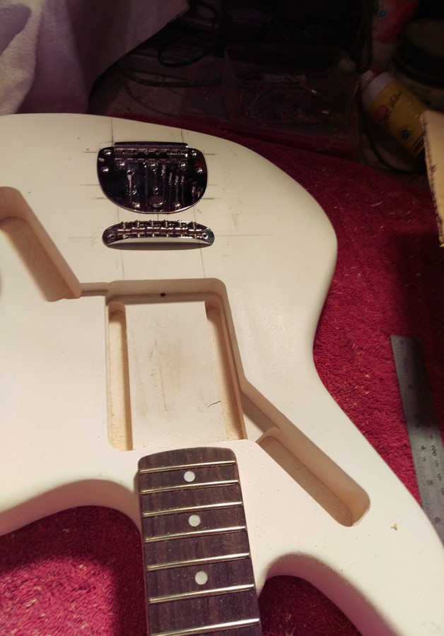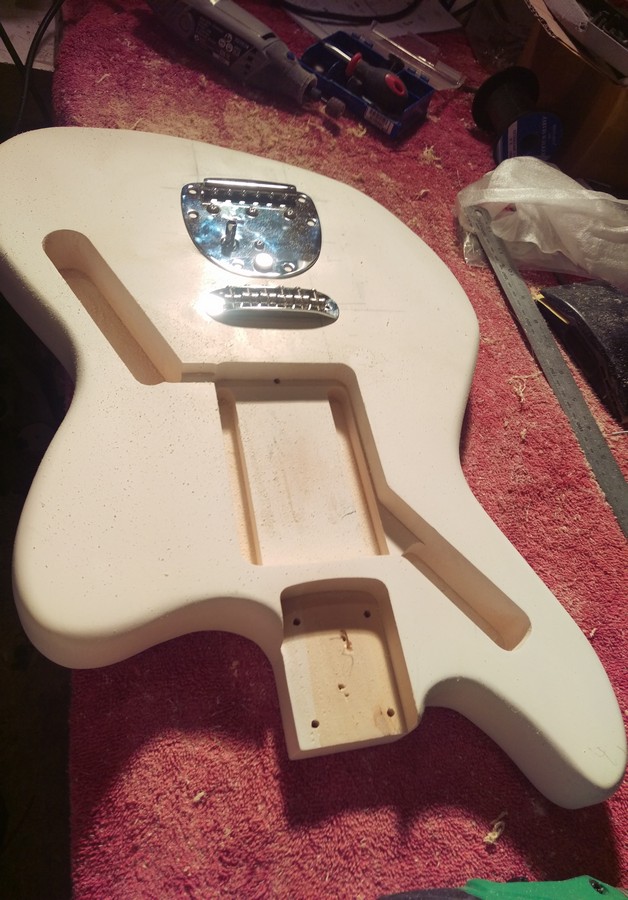 Well the hardest bit is done. Bridge pins drilled and cavity for the jaguar tremelo setup finished. Amazingly the neck is straight and the strings fit on straight so all is good!!