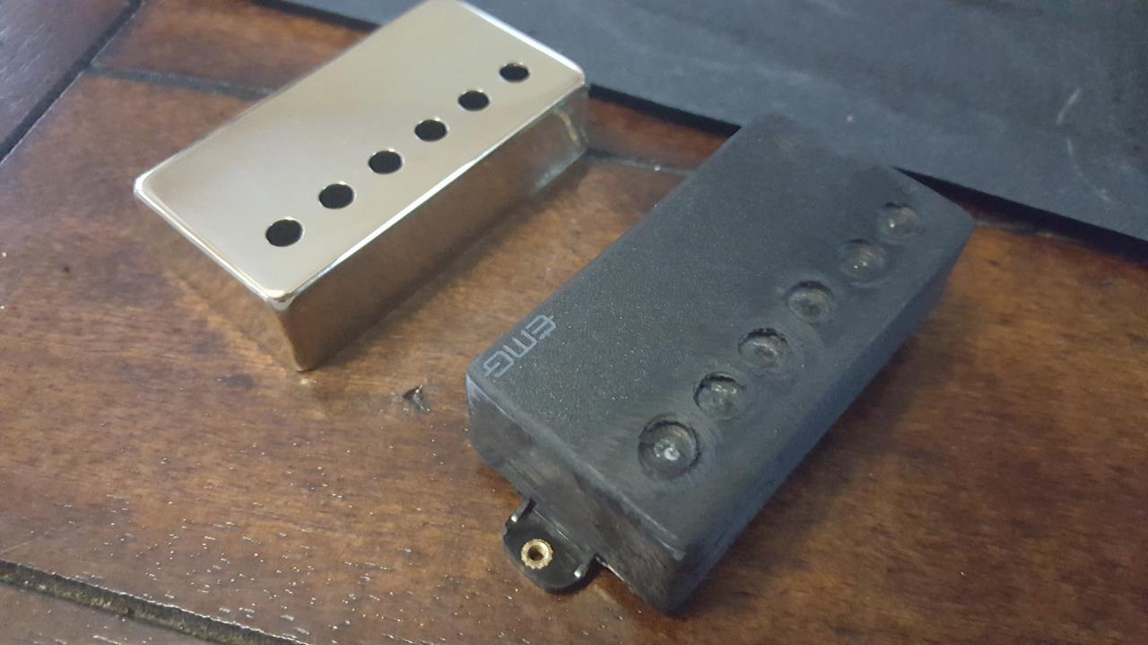 Over the last week when I've had some free time I've been working away on butchering my nice new EMG 60/81 pickups. I've made some creative use of my Dremel attachments to grind away the plastic covers and bore out some holes for the faux pole pieces. I think I finally have them to the state where the gold covers will fit. Now I'll just need to cut the heads off the pole pieces and epoxy everything together. Well and I'll also need to age the covers for that nice pretend vintage look.